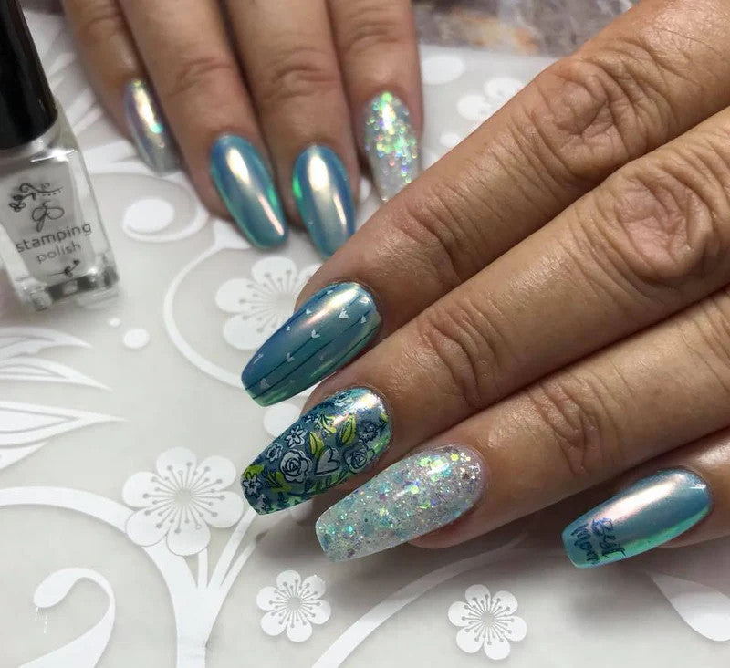 • Using your choice of tool (makeup sponge, brush, or silicone tools work best) apply Fuzion Holo sparingly to your applicator and rub into partially cured product.