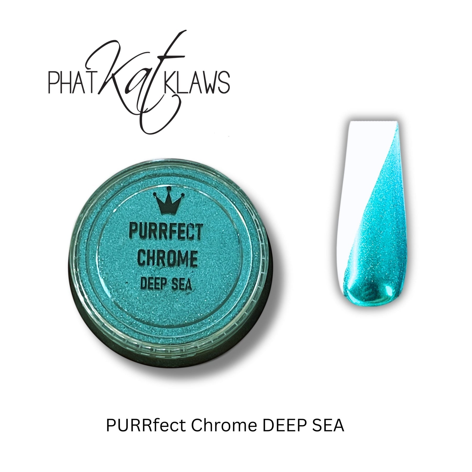 Phat Kat Purr-Fect Deep Sea Chrome applies beautifully over color or plain finished nail to add an amazing sea green chrome to your nails.