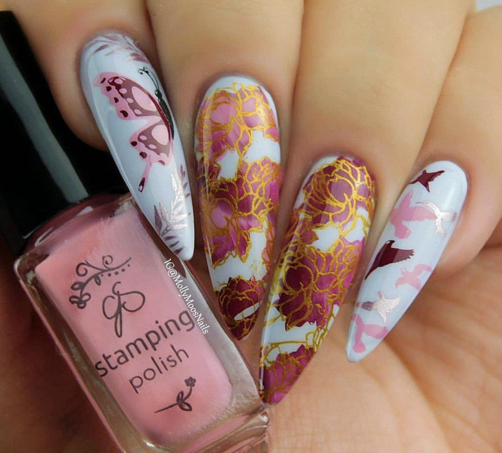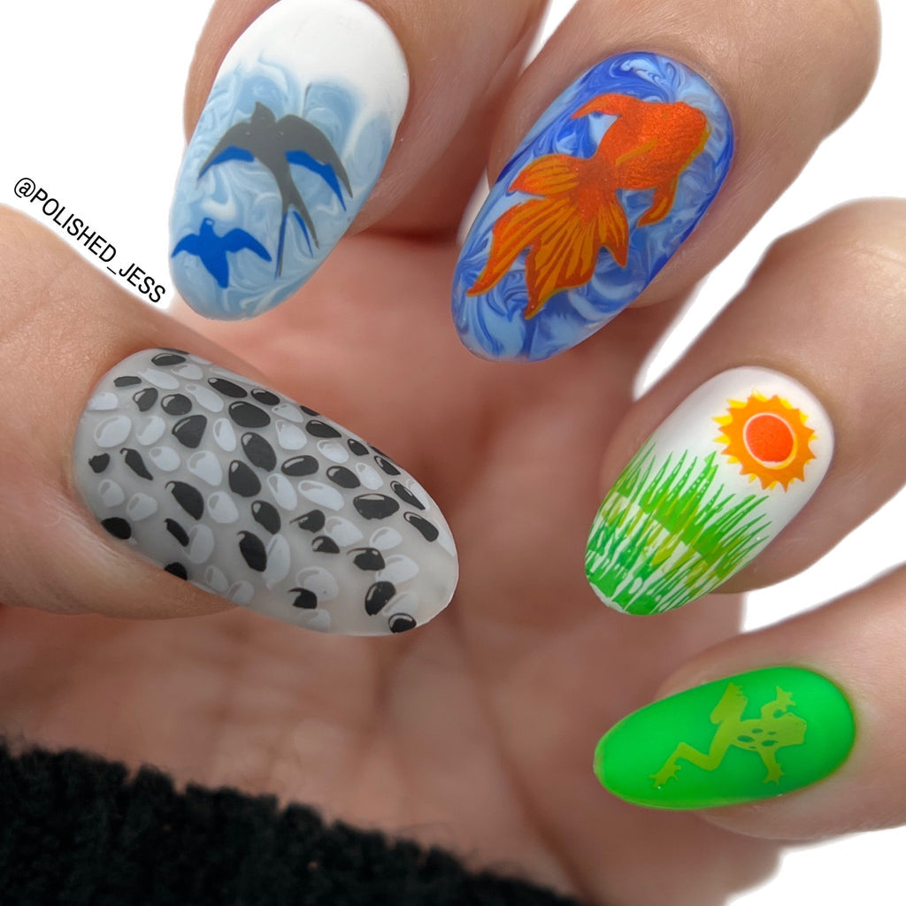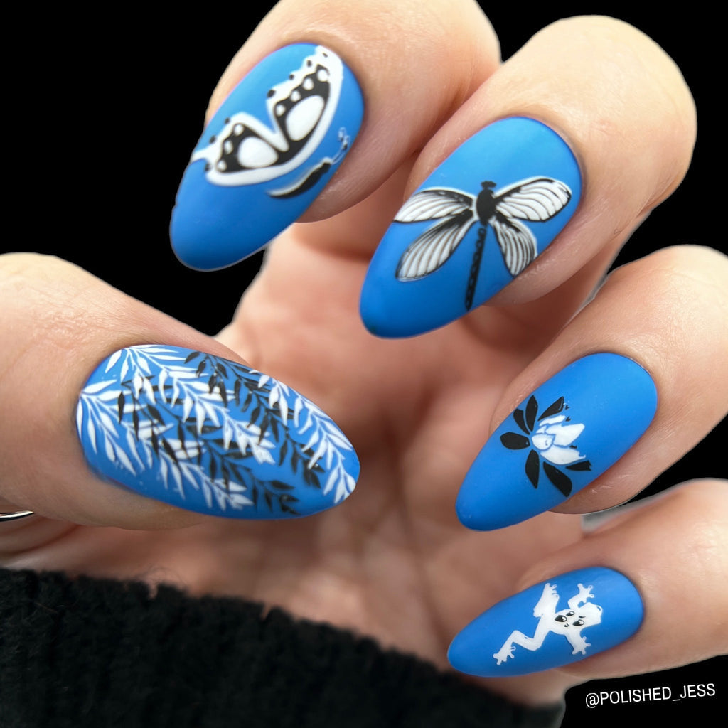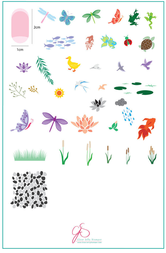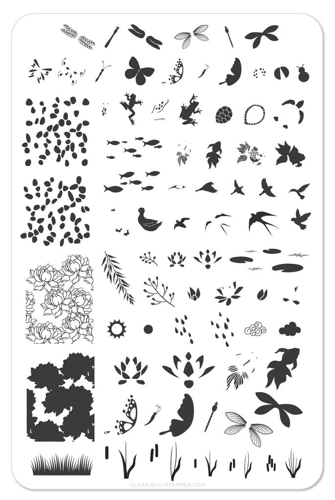 Dragonflies... Cat Tails... layered fish... even the lily pad! This nail art layered stamping plate offers various sizes of these cute pond greenery and creatures for your convenience! This nail art stamping plate has so many options for perfect spring and summer mani makeovers!!