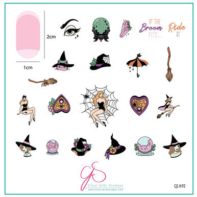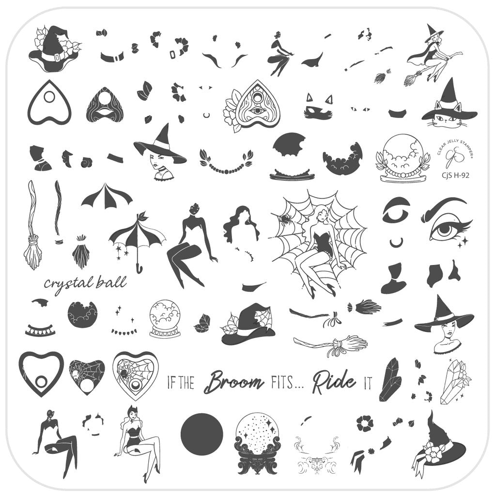 Discover your spooky side with Name that Plate (CjSH-92)! This steel nail art stamping plate is packed with Halloween-themed designs like witches' hats, crystal balls, and if the broom fits, ride it! Perfect for adding a little extra drama to your look, this plate also features flowers, cats, eyes, gems, spider webs, women, and umbrellas. Get creative and make your nails witchin'!