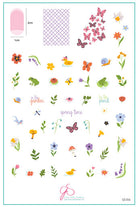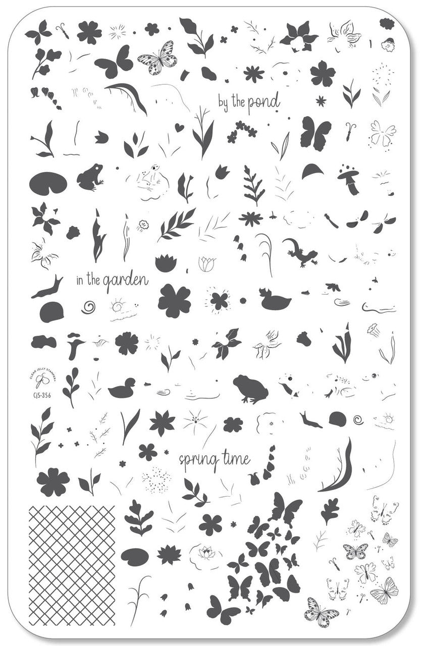 Introducing the enchanting Clear Jelly Stamper Layered Nail Art Stamping Plate CjS-356 'In The Garden'! Dive into a whimsical world inspired by the beauty of the garden. This plate is a delightful homage to nature's wonders, featuring delicate flowers like bluebells, snowdrops, and daffodils dancing alongside charming creatures such as frogs, snails, ducks, and butterflies.