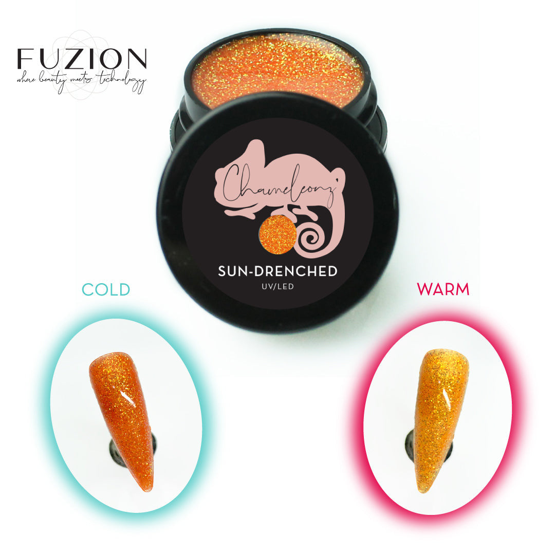 FUZION UV/LED CHAMELEONZ - SUN DRENCHED - 8 GM Sun-Drenched - (Cold) A bright tangerine tone with a fine multi glitter (Hot) A lighter sunrise orange In Fuzion's signature formula! Easy-to-use viscosity Highly pigmented Perfect for applying on top or embedding 2 thin coats are recommended for optimum results
