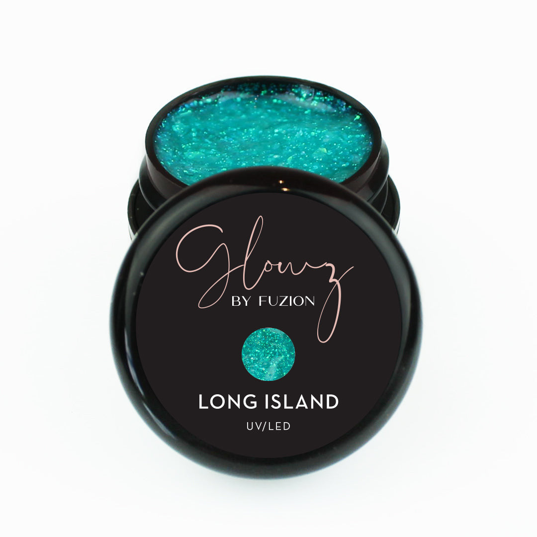 FUZION UV/LED GLOWZ - LONG ISLAND - 8 GM Long Island - Bright teal with small, medium, and large iridescent glitter In Fuzion's signature formula! Easy-to-use viscosity Highly pigmented Perfect for applying on top or embedding 2 thin coats are recommended for optimum results