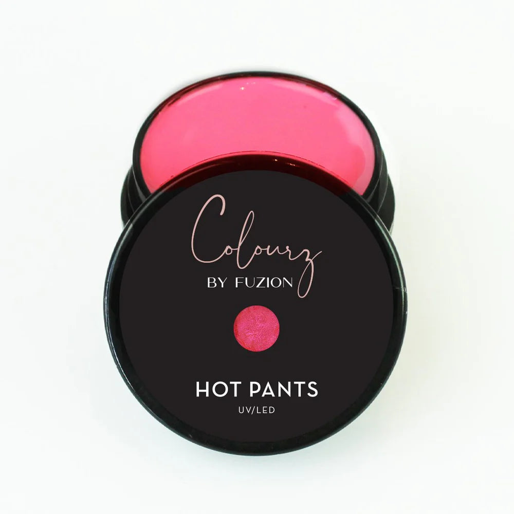 FUZION UV/LED COLOURZ - HOT PANTS - 15 GM Hot pink shimmer with a super fine glitter in Fuzion's new formula! Improved viscosity Highly pigmented Perfect for applying on top or embedding