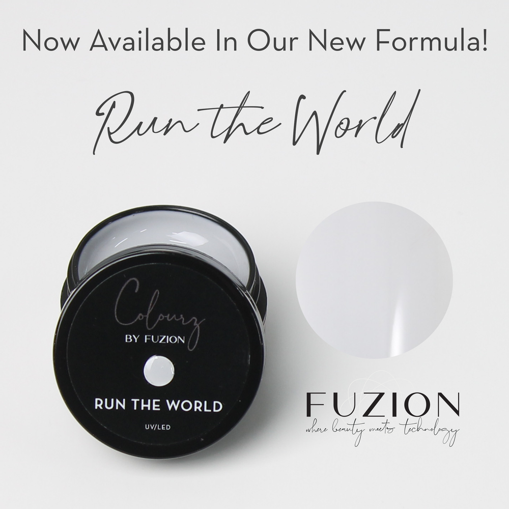 FUZION UV/LED COLOURZ - RUN THE WORLD - 15 GM Eggshell White in Fuzion's signature formula! Easy-to-use viscosity Highly pigmented Perfect for applying on top or embedding 2 thin coats are recommended for optimum results