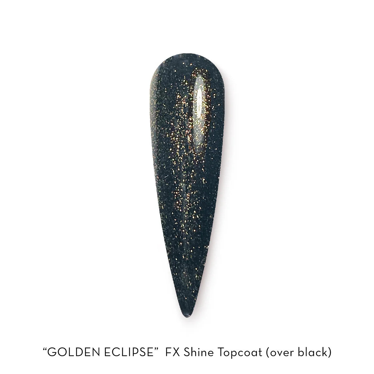 A fine gold shimmer with a tack-free shine. It's shown over a black base in the photo.