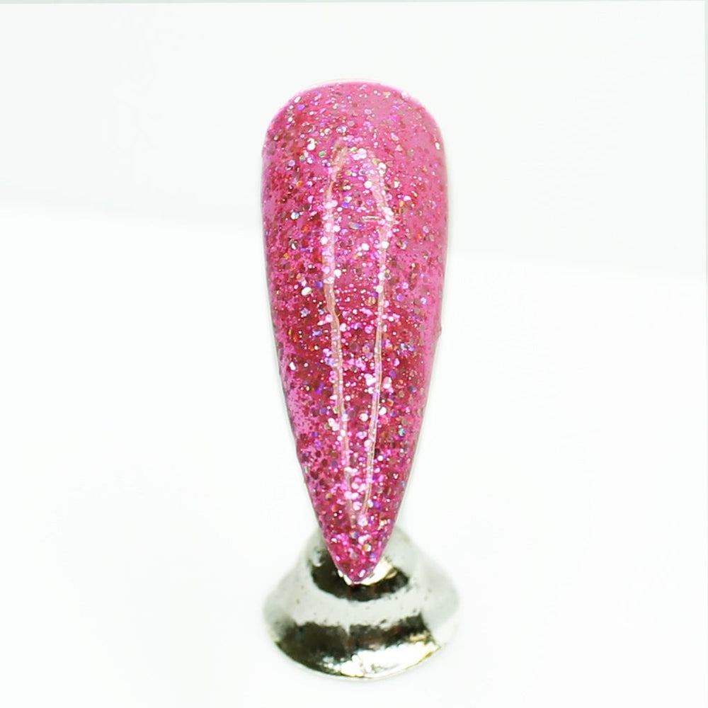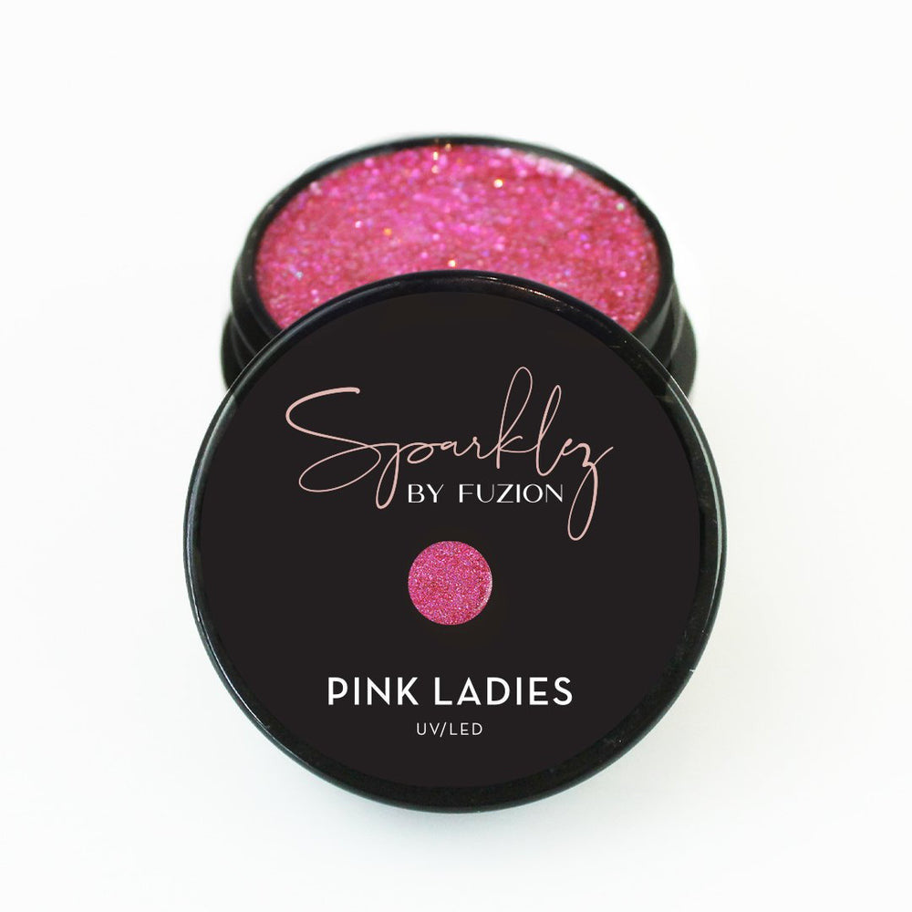 FUZION UV/LED SPARKLEZ - PINK LADIES - 15 GM Hot pink with small and medium holo glitter in Fuzion's new formula! Improved viscosity Highly pigmented Perfect for applying on top or embedding