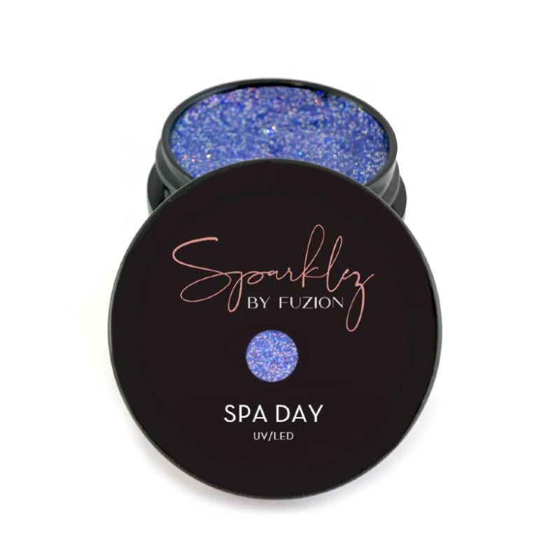 Spa Day is a small multi-sparkle denim blue with iridescent tones. In Fuzion's signature formula! Easy to use viscosity Highly pigmented Perfect for apply on top of embedding UV/LED 60s 15gm
