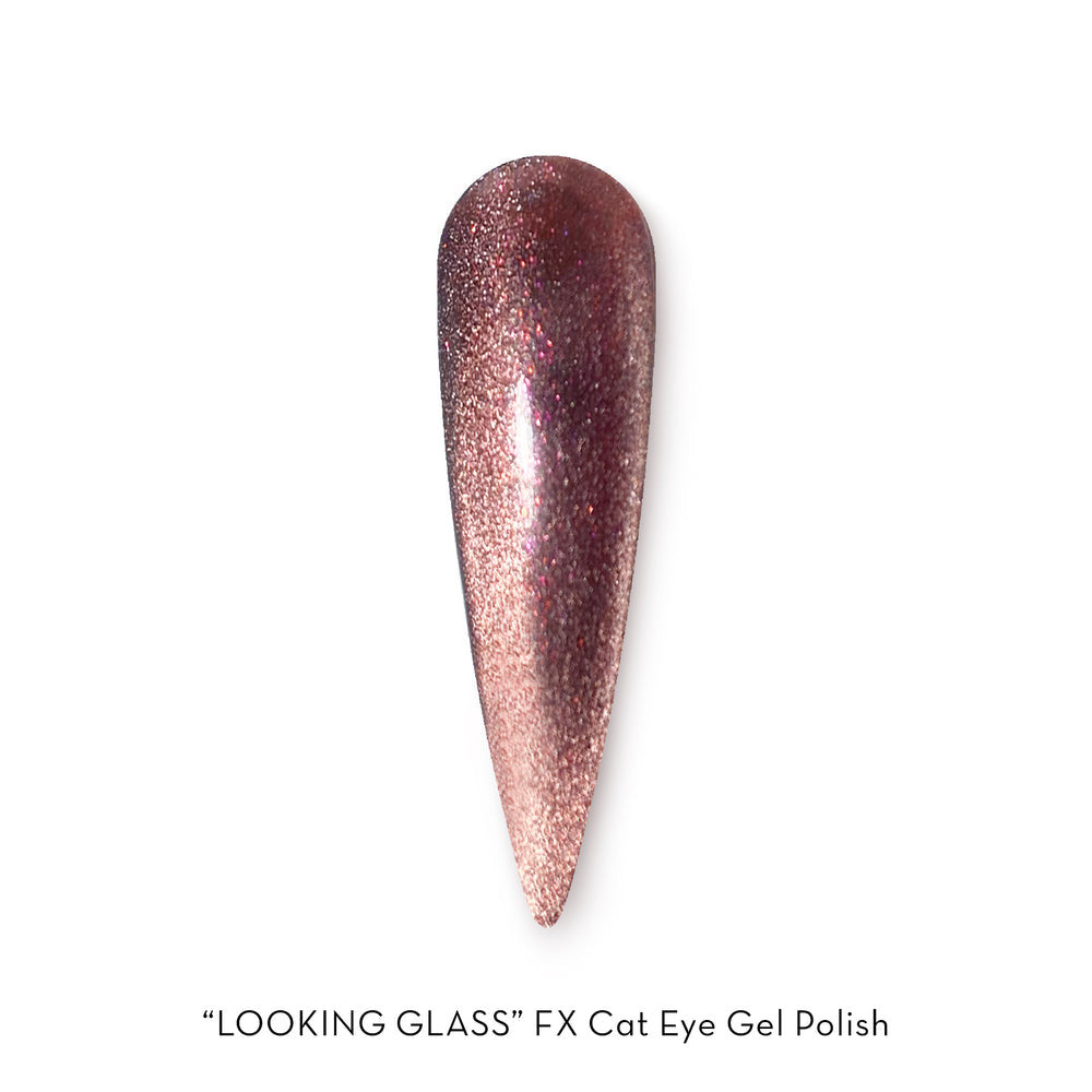 Looking Glass is a warm chocolate metallic when applied without the Cat Eye effect. With the Cat Eye effect it's an amber glass with bright copper & gold micro glitter.