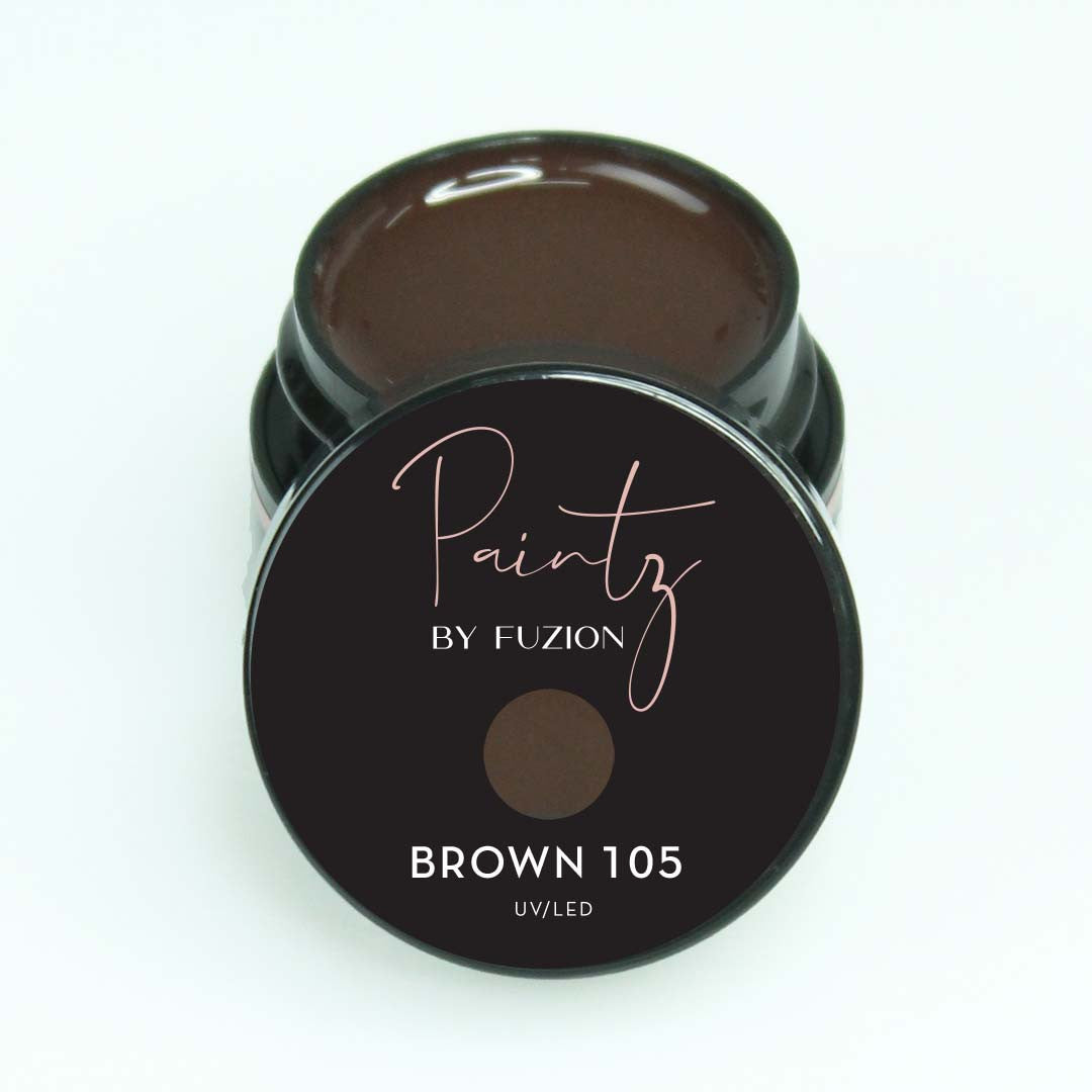 FUZION PAINTZ - BROWN 105 - 8G Thin viscosity Paintz are great for full colour, detailed art, one stroke and more! Cures to a high shine with no tacky layer! One coat coverage, and amazing workability. UV only, cure 2 minutes.