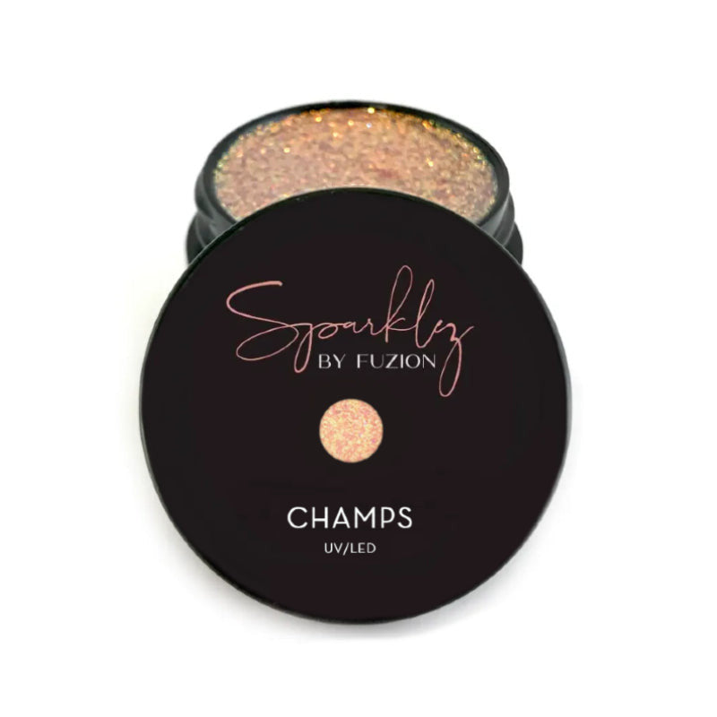 Champs is a small multi glitter nude with gold and iridescent undertones. In Fuzion's signature formula! Easy to use viscosity Highly pigmented Perfect for apply on top of embedding UV/LED 60s 15gm