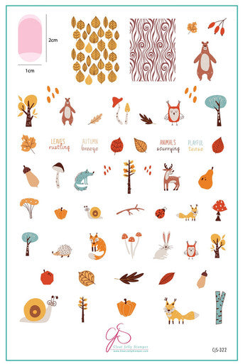 Welcome to Playfully Autumn (CjS-322) Steel Nail Art Layered Stamping Plate, where bears, trees, mushrooms, owls, leaves rustling, acorns, autumn breeze, a playful tease, deer, snails, ladybugs, rabbits, foxes, opposum, pumpkins and animals scurrying all gather for a whimsical time! Add a splash of fun to your nails with full coverage of these playful critters that will make your nails look stunning!