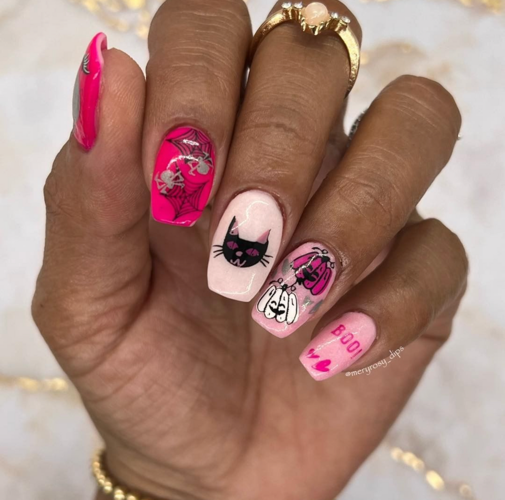 Don't forget the scary black cat with whiskers that adds a spooky touch to the designs. Skulls and spiders with their intricate webs complete the ensemble, making sure your nails are the spookiest and the most playful in town!