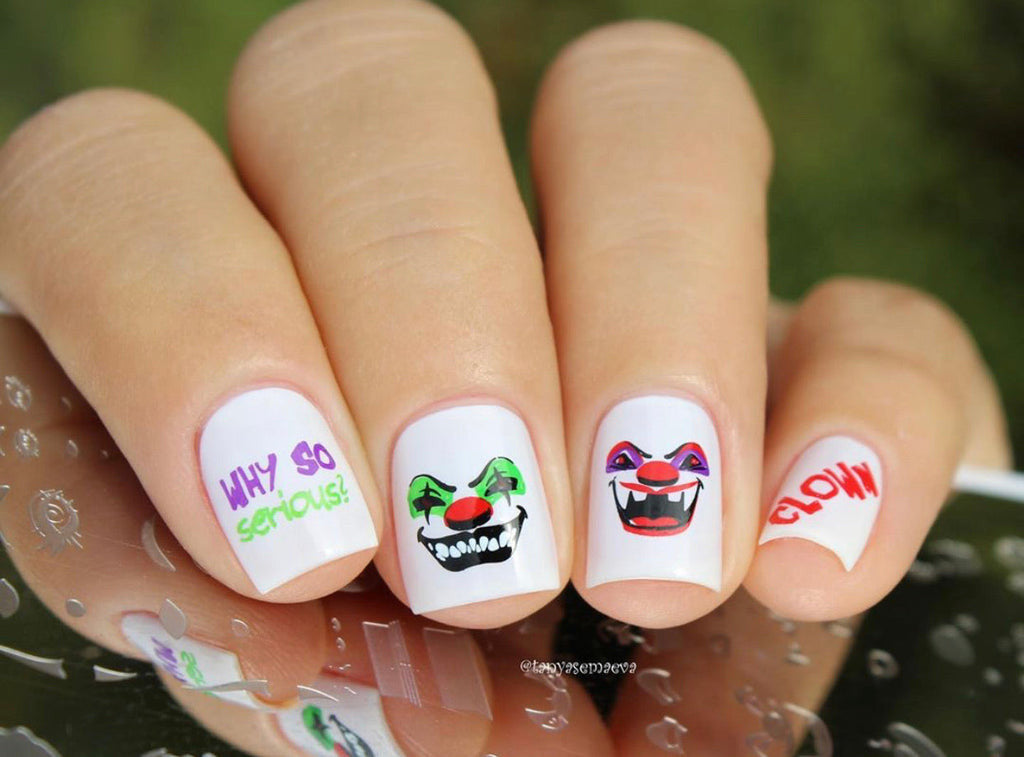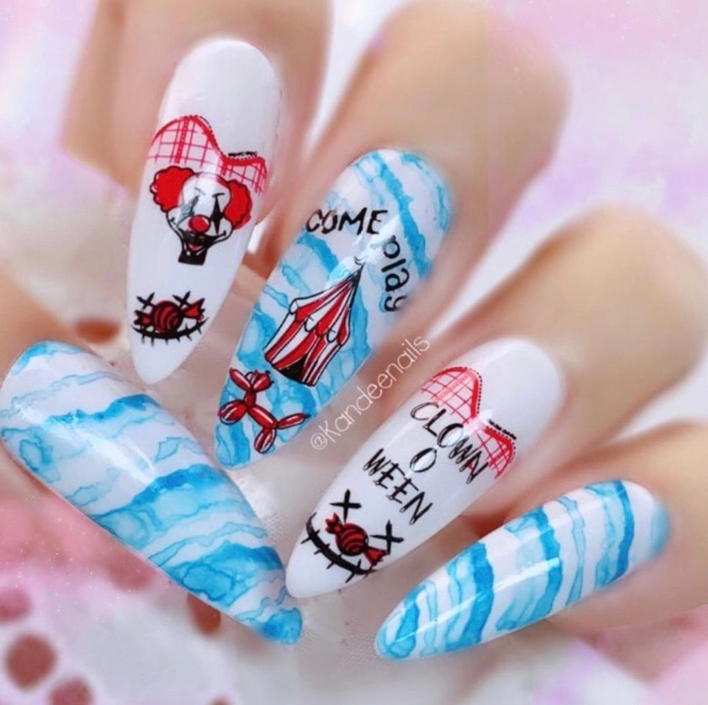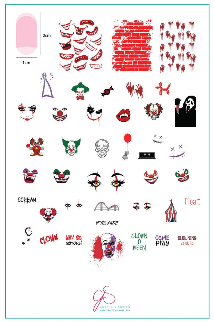 Enter a world of sinister clowns with their eerie sayings like "Why so serious?" and "Clowning around, if you dare." Come play in the dark carnival of "Clown0ween," where screams echo and roller coasters of fear take you on a wild ride. Beware of fangs and lips that tempt and tease, for lurking within are full-coverage skeletons, knives, and balloons stained with blood.