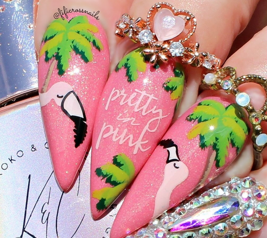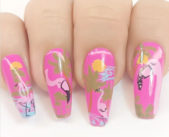 Embrace the spirit of summer with a tropical flair, featuring flamboyant flamingos and swaying palm trees that evoke the carefree vibes of paradise. Dive into creativity with splat patterns that add an unexpected modern twist to your nail art. Let you nails be pretty in pink!