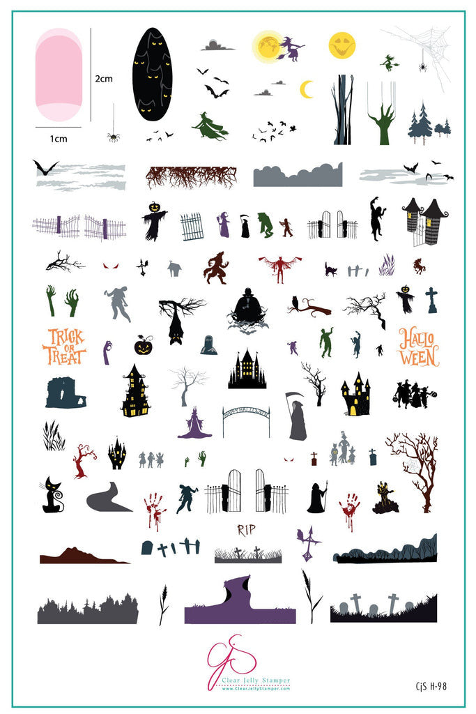 Armed with your favorite nail art stamping polishes and a touch of imagination, the CjSH-98 plate lets you unleash the playful spookiness of Halloween onto your nails. With a lineup that includes scary goblins and ghosts, a moonlit cemetery, gates to the unknown, mummies, witches, haunted mansions, black cats, bloody hands, trick-or-treat delights, pumpkin grins, and a menagerie of spiders and bats, you're all set to craft a nail art story that's equal parts eerie and utterly enchanting!