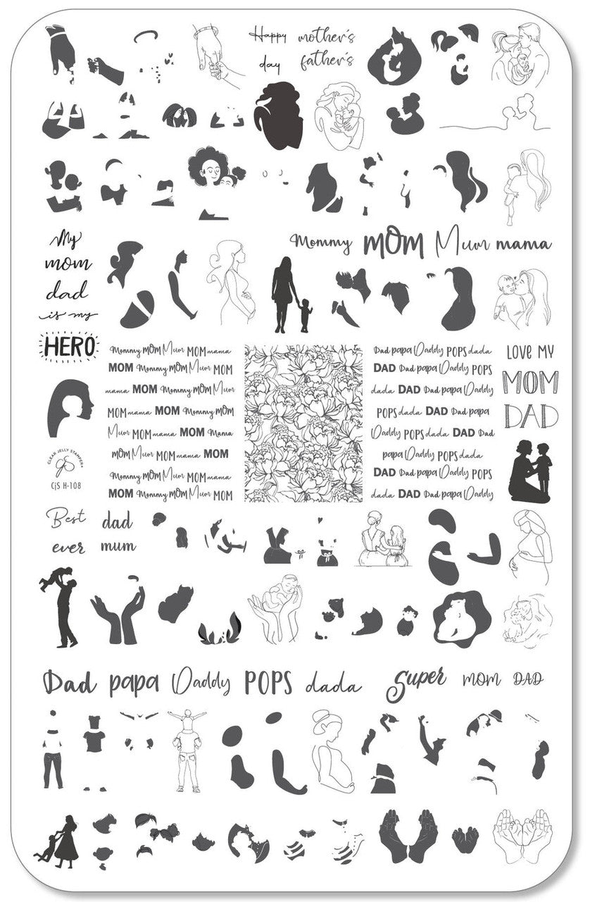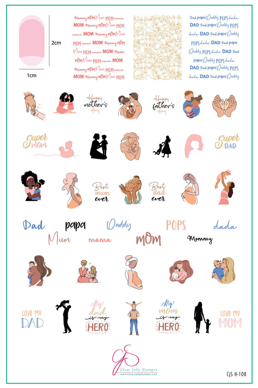 Introducing Clear Jelly Stamper's heartwarming steel nail art layered stamping plate, CJSH-108, "Mom & Dad's Day." This delightful plate represents the bond between parents and children, celebrating the cherished roles of both super moms and super dads. With endearing motifs like "Super Dad" and "Super Mom," as well as phrases like "Love My Dad" and "My Dad is My Hero," this plate captures the essence of gratitude and admiration. Perfect for celebrating special occasions like Mother's Day and Father's Day, it features heartfelt sentiments that include "Happy Mother's Day" and "Happy Father's Day," ensuring every manicure is a loving tribute to parental love. From tender moments like holding hands and family hugs to the joys of pregnancy, babies, and children, this plate beautifully portrays the journey of families, capturing the essence of love, warmth, and togetherness. Let CJSH-108 "Mom & Dad's Day" be your tool for expressing gratitude and celebrating the extraordinary bond between parents and children through nail art that speaks from the heart.