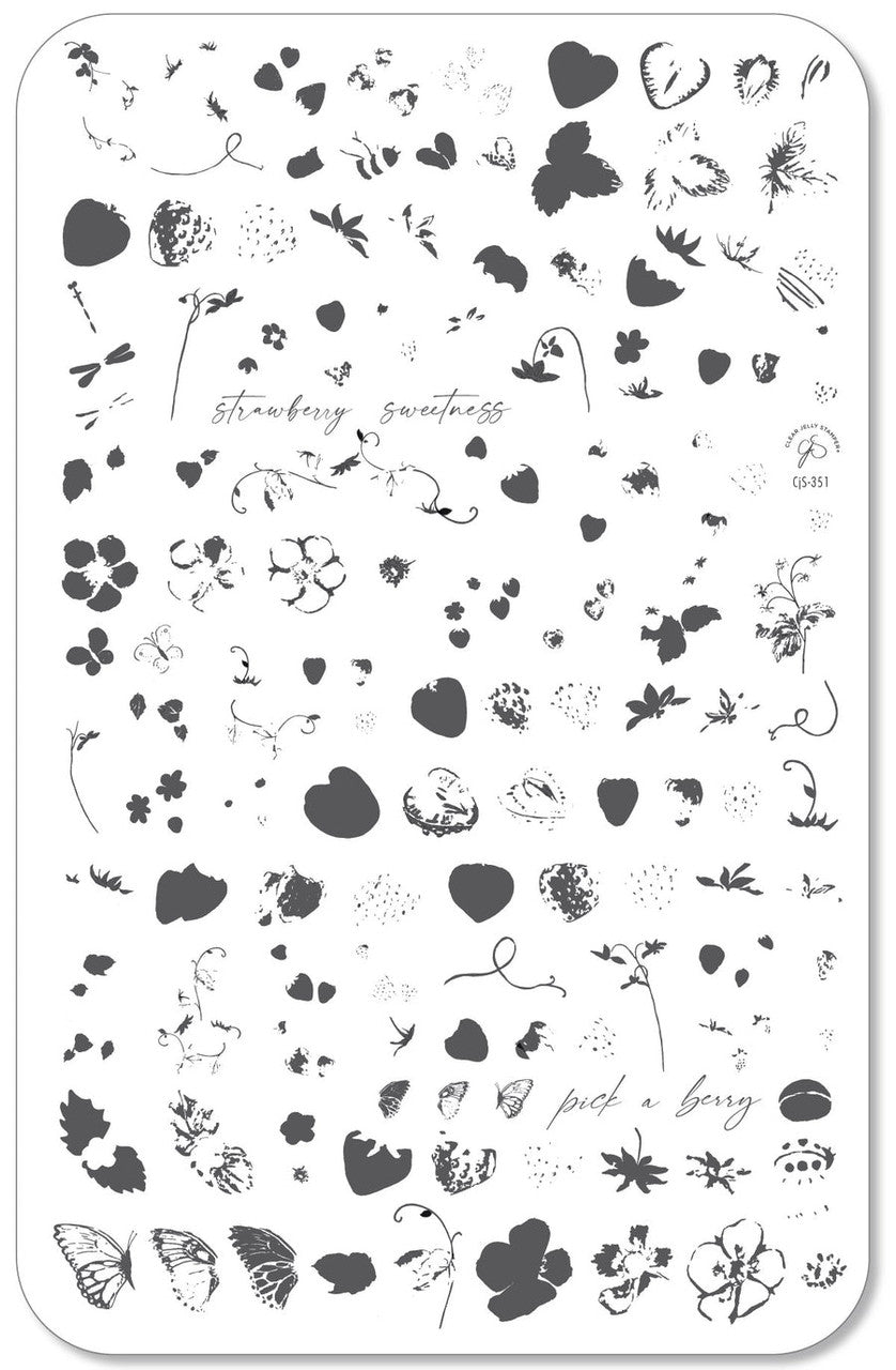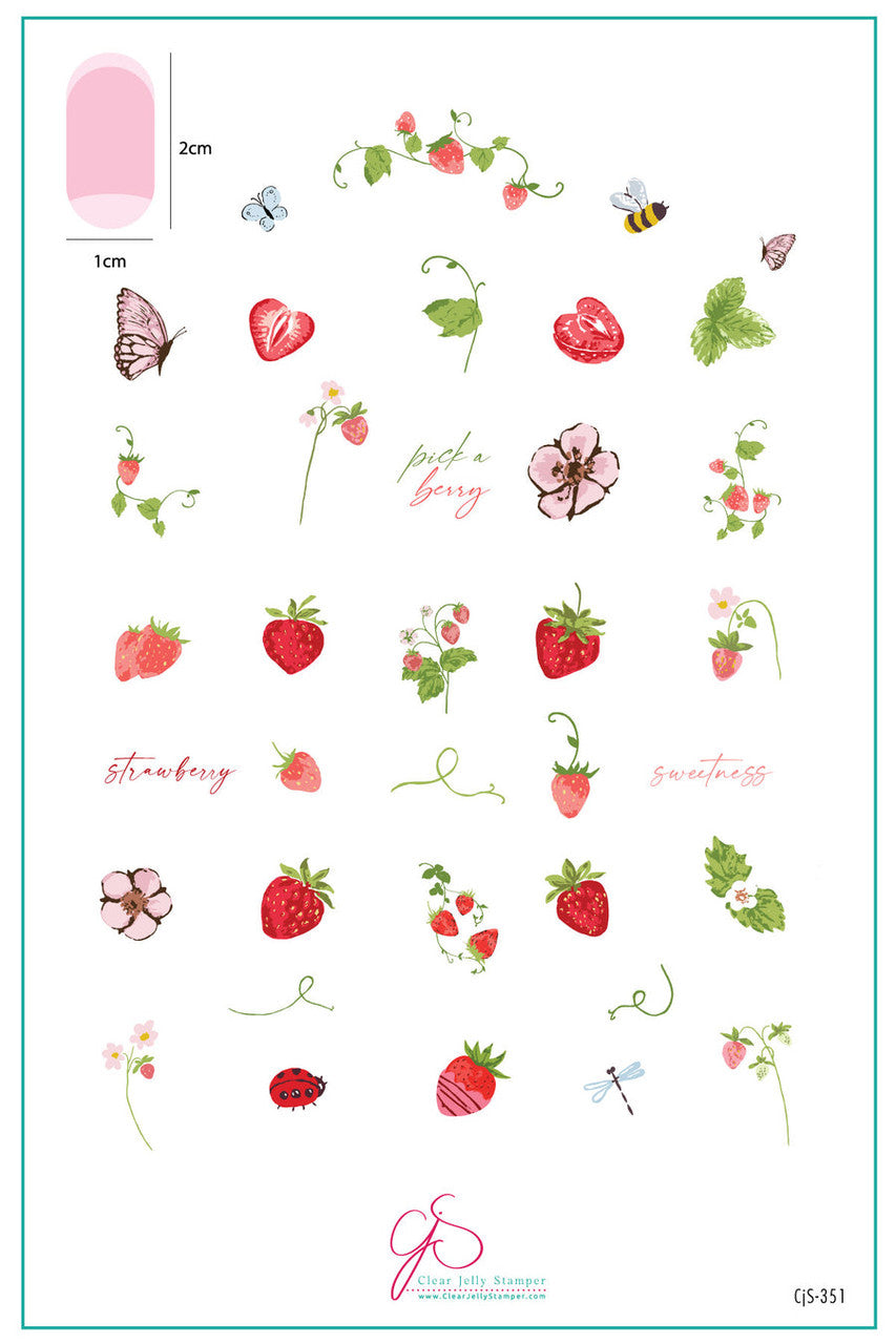 Introducing the "Strawberry Sweetness" by Clear Jelly Stamper CjS-351! This plate is like a little garden party on your fingertips, bursting with the sweetness of strawberries and the fluttery charm of butterflies, bees, dragonflies, and ladybirds. Imagine delicate strawberry plants reaching out alongside plump strawberries, while whimsical insects dance around them, creating a playful and delightful scene. Each design is meticulously hand-drawn, adding a touch of artisanal flair to your nail art adventures. Get ready to bring a slice of summery sweetness to your manicures with this adorable stamping plate! ????