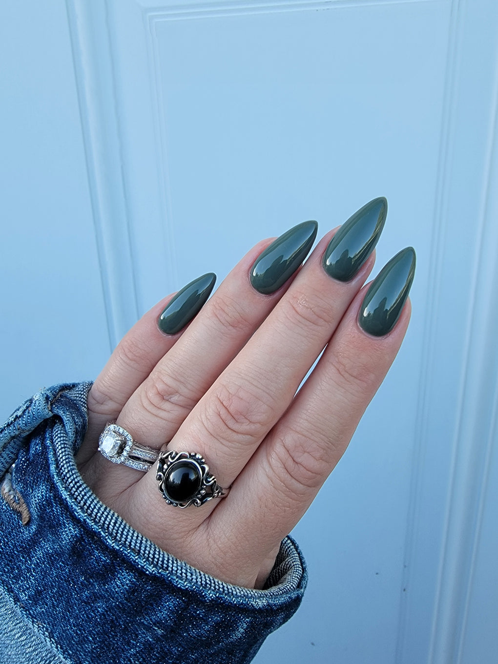 A beautiful army green. This perfectly balanced olive-toned green is great for year-round wear.