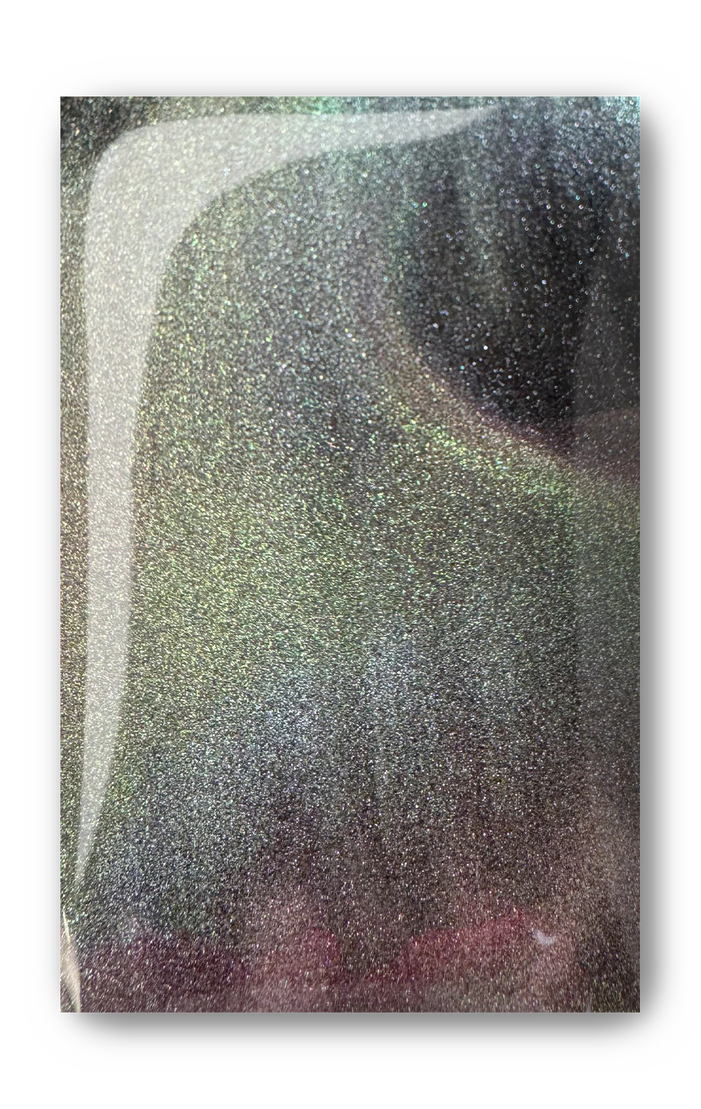 A black cat eye that has a multi-color shift with purply pink, greens and golds. Extremely Cosmic!