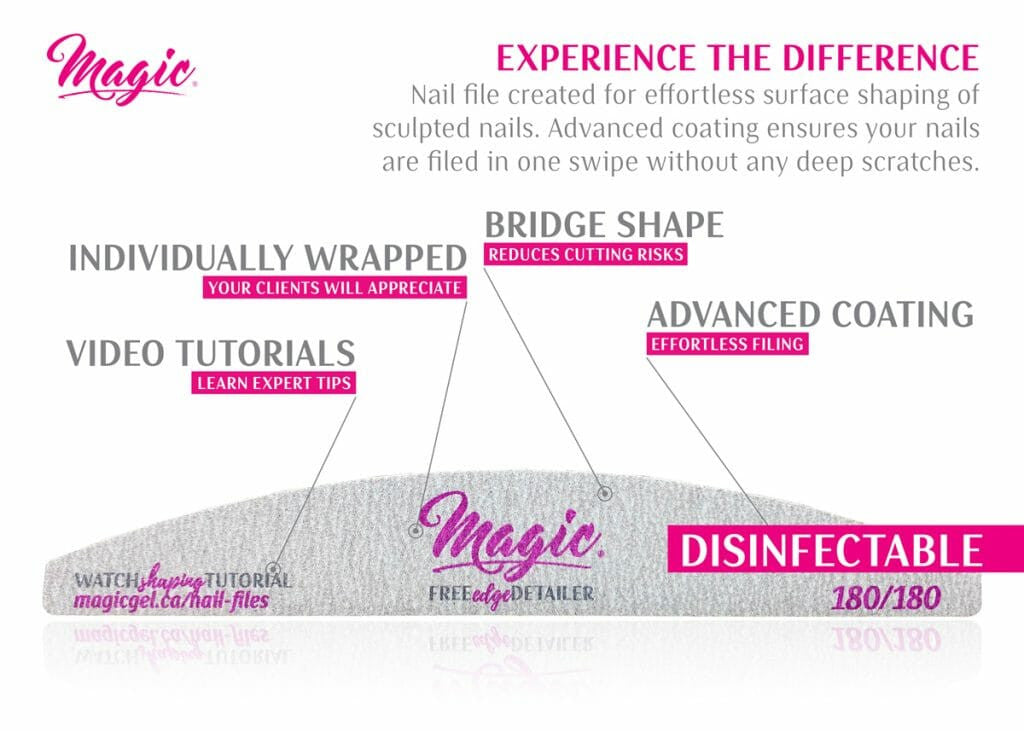 Free Edge Detailer is perfect for finish filing, especially the free edge. Gentle, yet abrasive grit level will ensure there is no mechanical separation on the free edge of your freshly sculpted set. The file is cushioned a specific way. It is thin, yet bouncy for your fast and precise shaping. 180 grit on both sides is also ideal for a manual nail plate prep. Due to its cushioning the file will not over file the nail plate, nor will it leave flat sports.