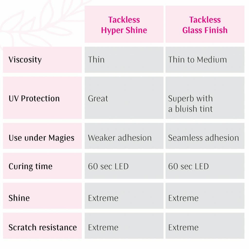 This top gel was developed for use under larger pieces of Magies, as it offers completely seamless incorporation. Tackless Hyper Shine is also great for use under Magies and works as a substitute for Tackless Glass Finish.