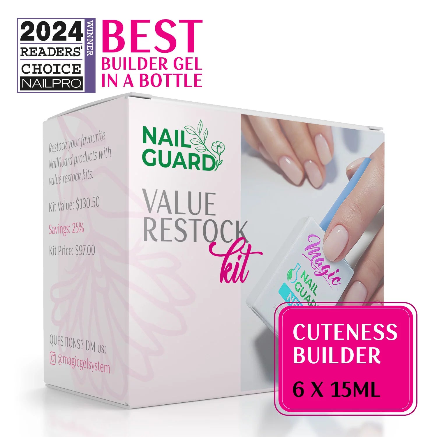 You’ve been buying NailGuard™ by the tens so that you don’t run out. After all, not only is it the healthiest choice out there for gel manicures, nail overlays, and extensions, NailGuard™ saves you time and money. But you wanted even better value, and we want our customers happy. That’s why we’re launching the NailGuard™ Value Restock Kit. It’s the same great product in a value pack of 6 bottles that saves you a whopping 35% off. This NailGuard™ Value Restock Kit: