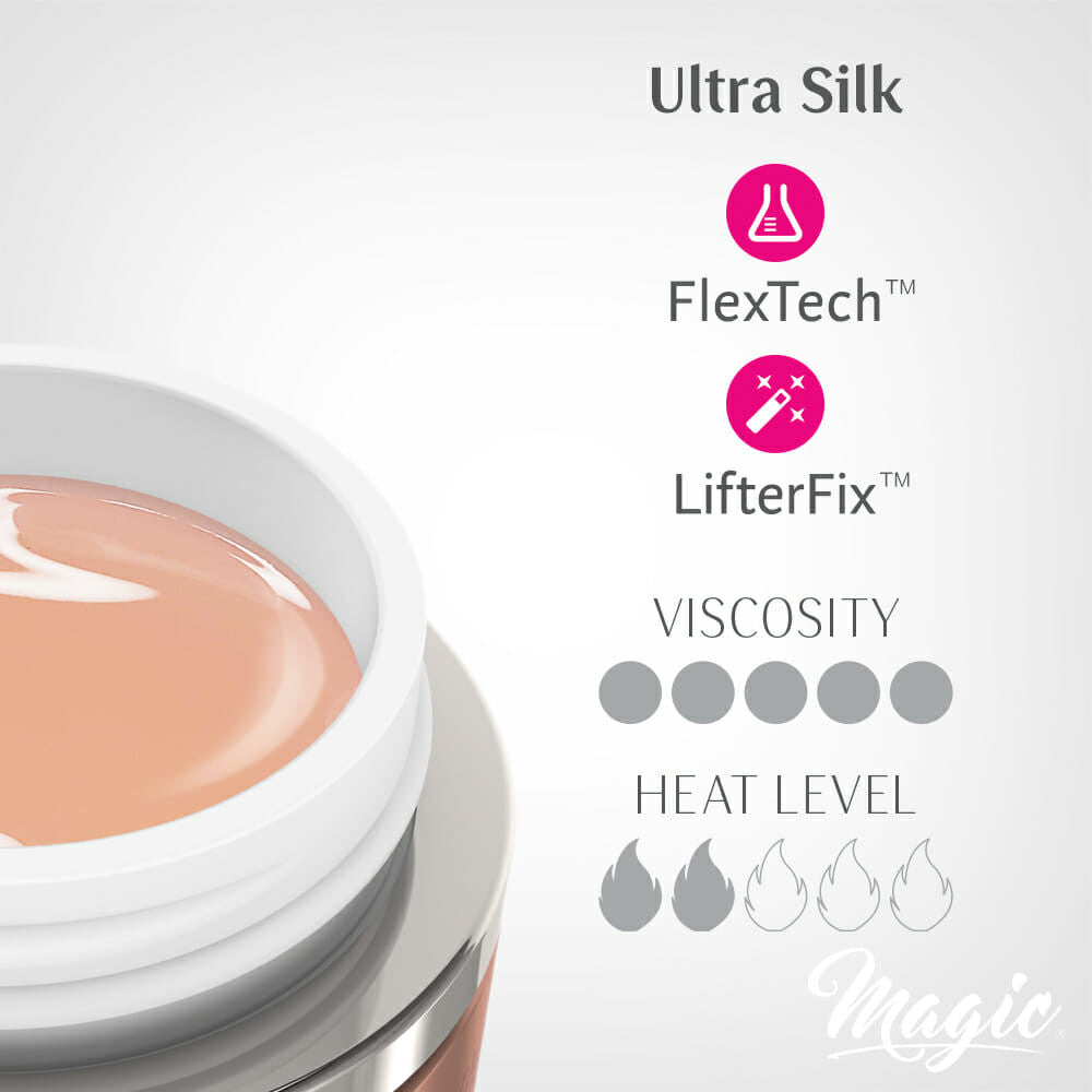 Ultra Silk builder gel offers superior adhesion and was developed for clients with consistent lifting nail problems. Unique FlexTech‚Ñ¢ technology makes the gel soft, workable at application and then stable as soon as you are done sculpting and remove the brush. Ultra Silk builder gel is more stable and offers better sculpting control ability. It will not self level and is recommended for experienced nail technicians. Colour: Peach tinted clear Cure time: 2 min UV in 36 watt lamp, ~90 sec LED (depends on the bead thickness) Application tip: to get a perfect coverage apply with a slow soft touch using Magic Brush Size: 15 ml, 60ml, 120ml