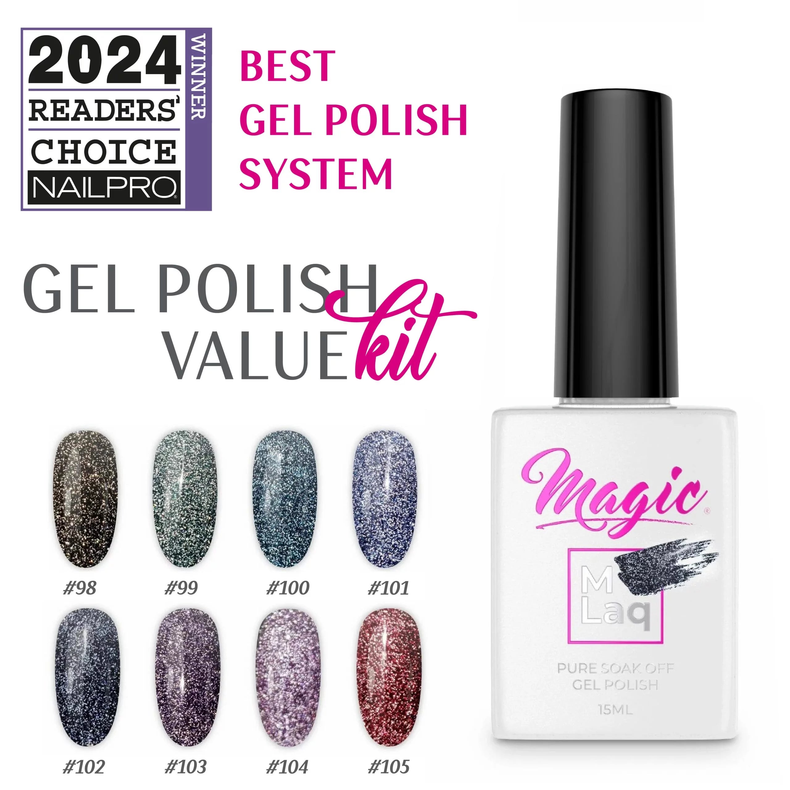Gel MLaq Reflections in value kit and save big! MLaq Reflections will bring unprecedented reflectance to all of your designs. Can be used for full coverage, ombre, nail art and more. Soft, instant self leveling formulas will ensure even and effortless coverage. These gel polishes are perfect for full coverage, ombre designs and hand painting. Odor free MLaq will help you keep health a priority and enjoy a fresh work space. Nature Reflections includes: