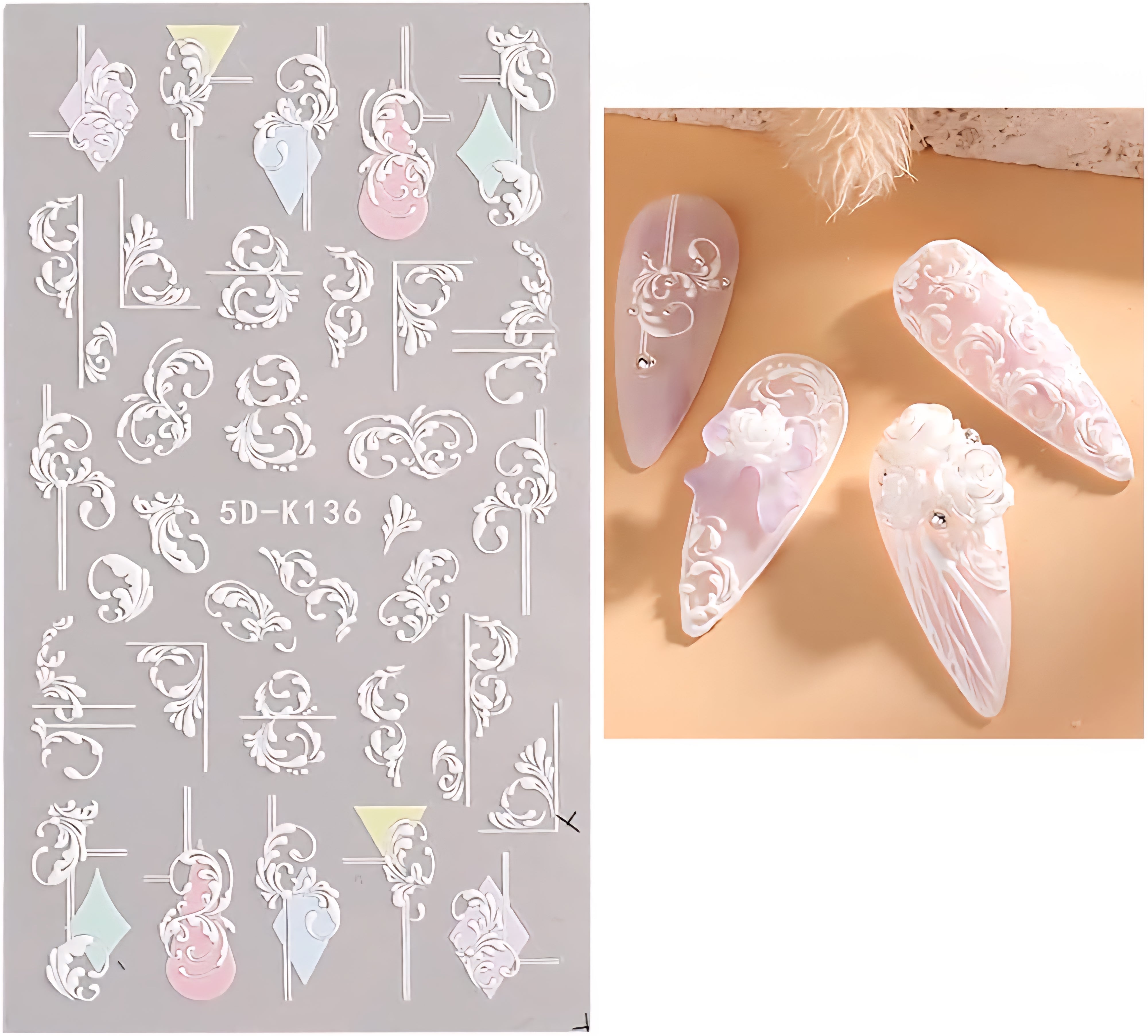 5D-K136 delivers ornate baroque-style flourishes with a sculpted, raised texture that looks carved into the nail. Use it to frame 3D florals, accent milky pinks, or add regal detail to long, glossy tips. This set turns any mani into full-on luxury.