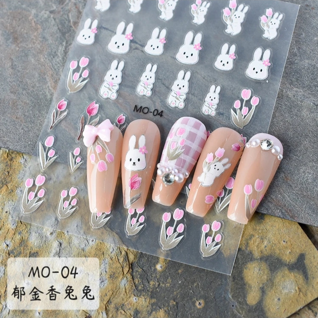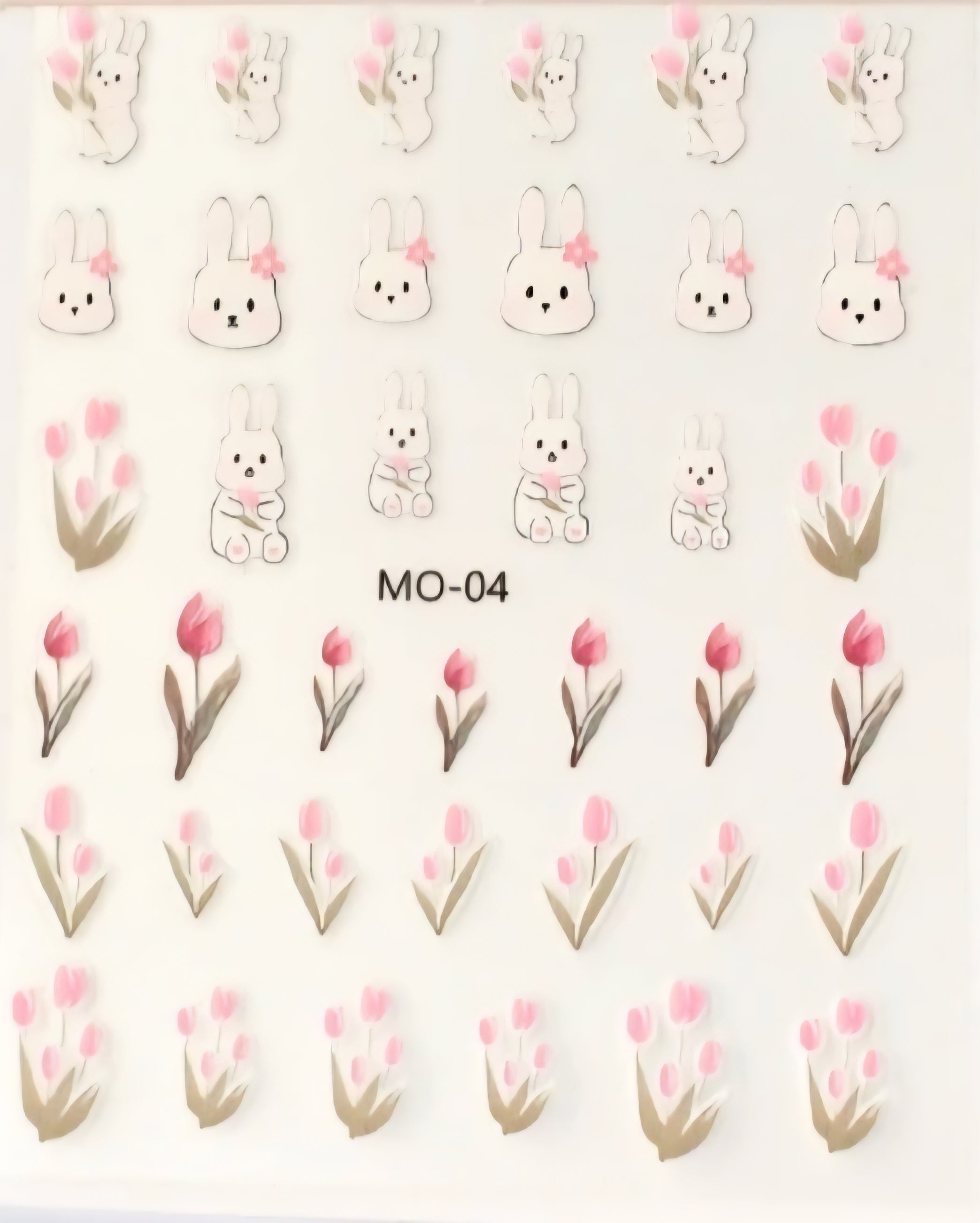 The MO-04 sticker sheet is pure springtime charm. Featuring cuddly white bunnies with little pink flower crowns and delicate tulip bouquets, this design is perfect for sweet, feminine manicures. π·π°