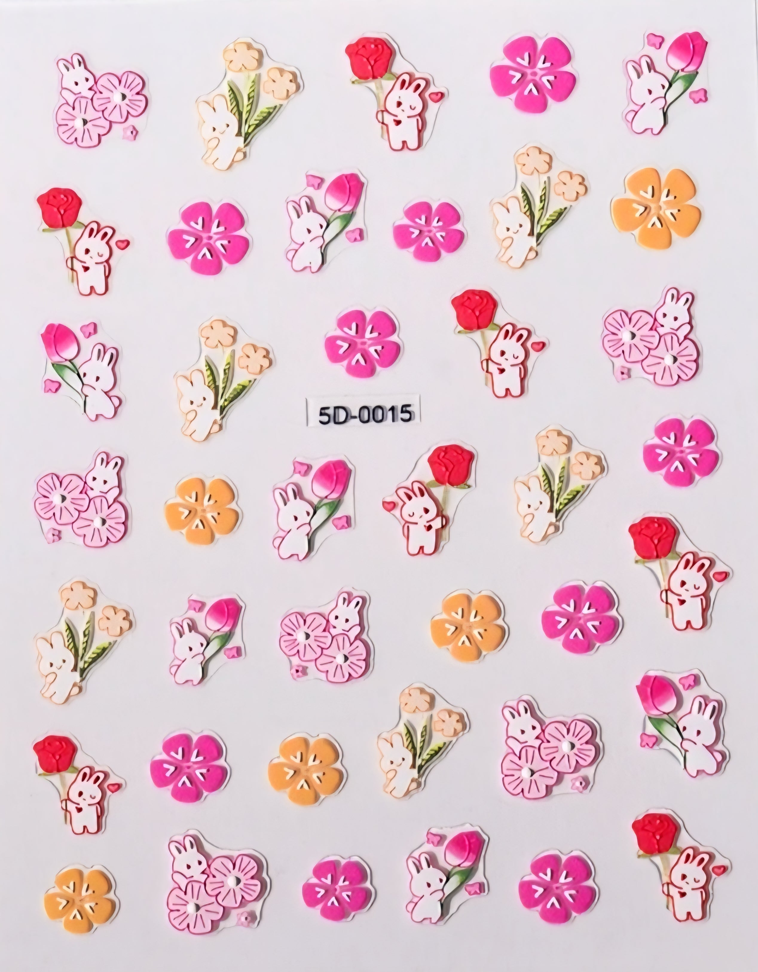 The 5D-0015 sticker set is basically the Easter bunny’s dream journal. With white and pink cartoon bunnies holding tulips, bouquets of pastel flowers, and cheerful pink and orange blooms, this collection is ultra-sweet and playful. Ideal for spring, baby showers, or just living your soft-girl fantasy all year long.