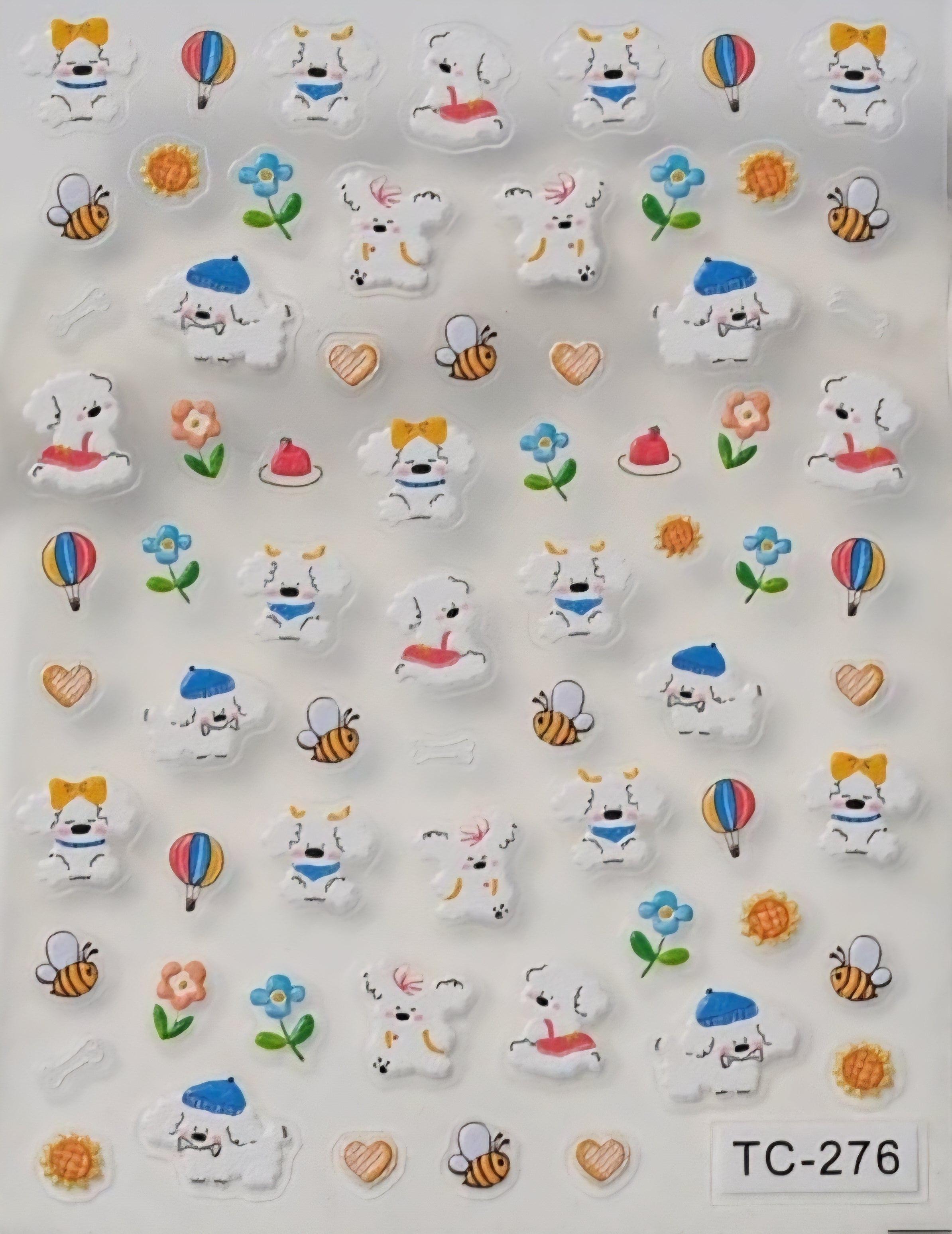 Let your nails take flight with TC-276, the ultimate cuteness combo of one happy pup, buzzing bees, hot air balloons, and pastel florals. This 5D sticker sheet is a cheerful, storybook escape that adds playfulness to any manicure.