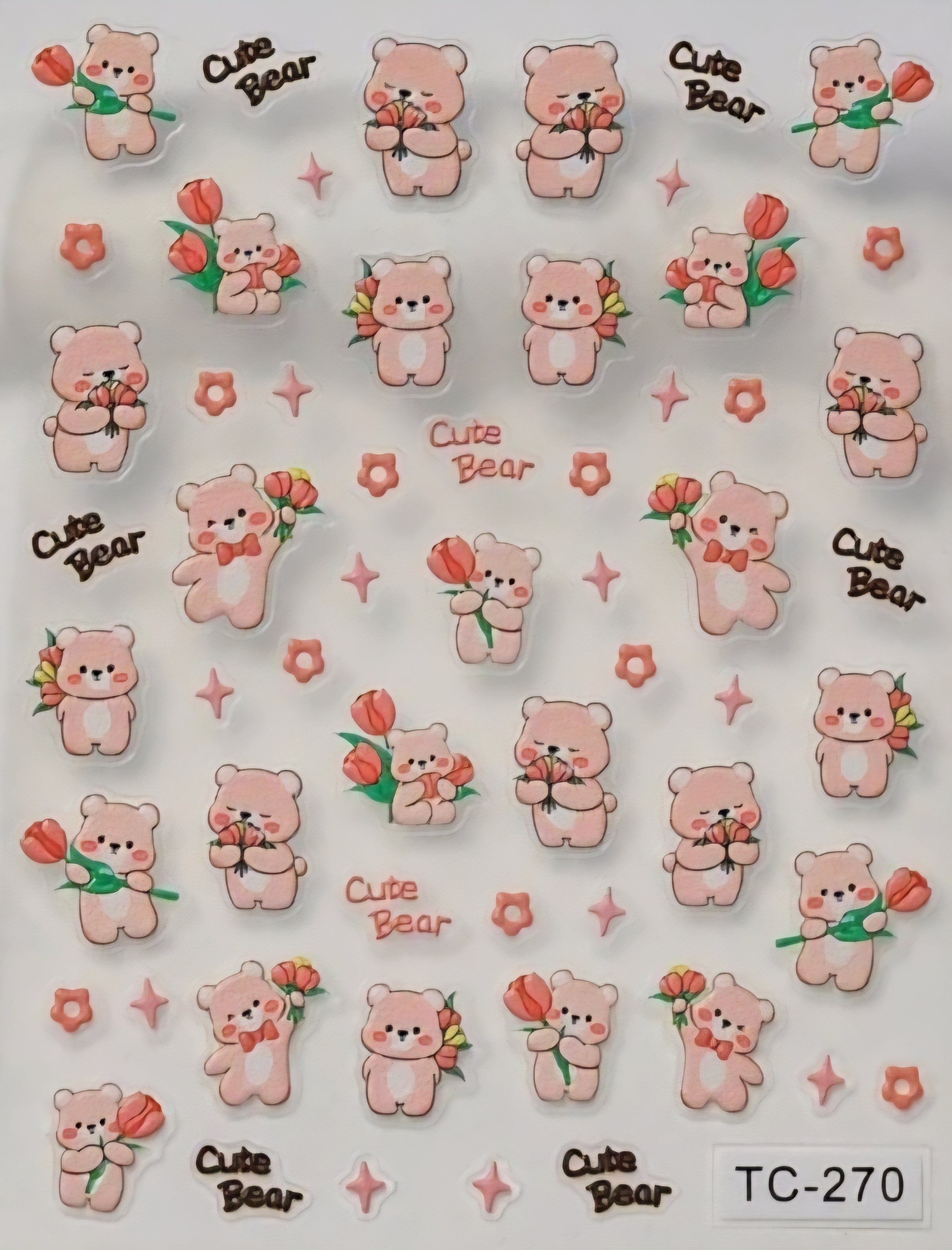 Bring out the soft, snuggly side of your nail game with TC-270, a 5D nail sticker sheet packed with lovable pink bears and tulips galore. Each sticker is delicately raised for a charming embossed effect.