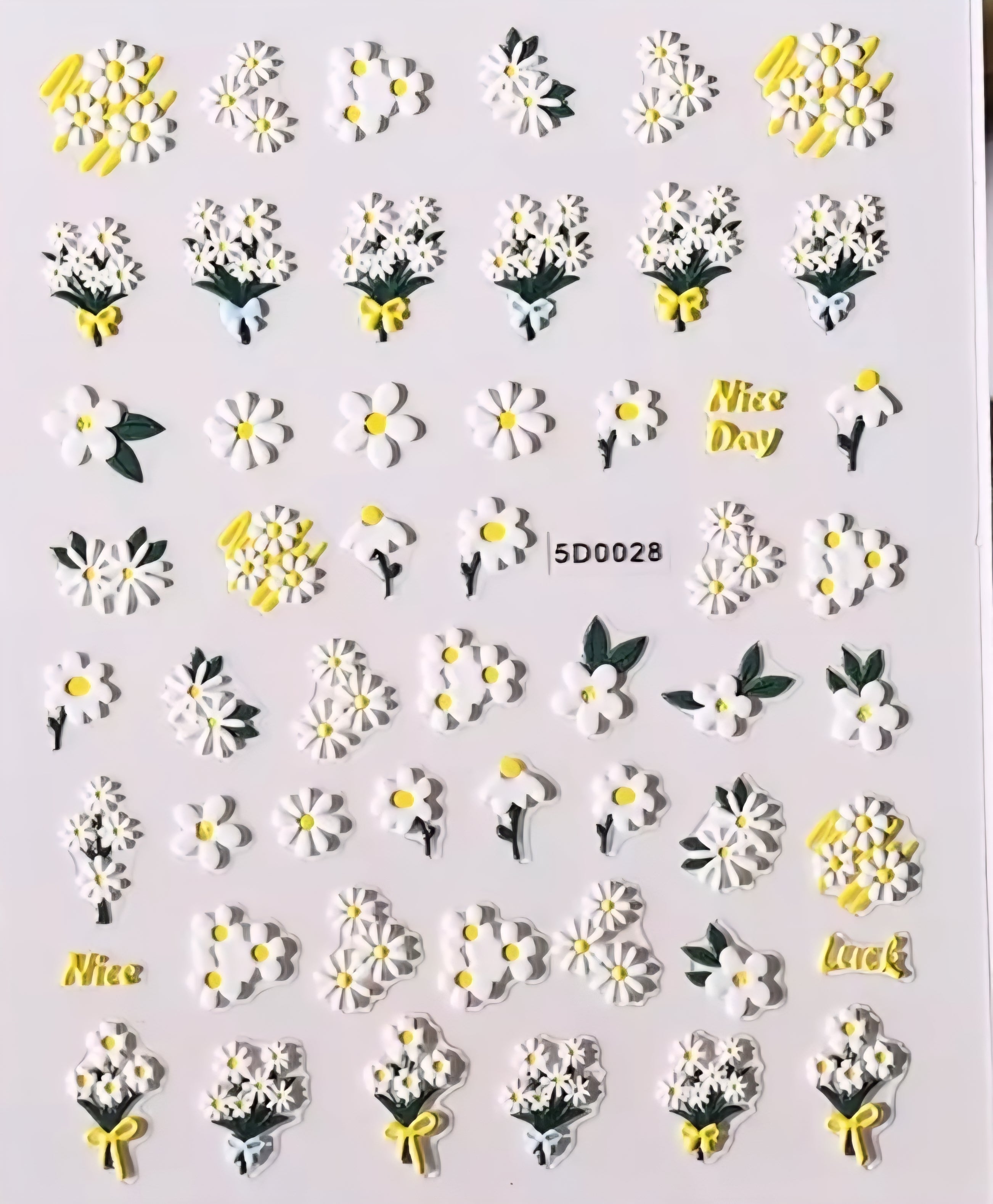 Say hello to pure floral happiness with Daisy Mood 5D Stickers – Design 5D0028, a sweet, elegant collection of white daisy bouquets, single stems, leafy greens, and minimalist messages like “Nice Day” and “Luck.” Designed in soft matte white, cheery yellow, and muted green tones, these 5D puff stickers add a dimensional, serene charm to any mani.