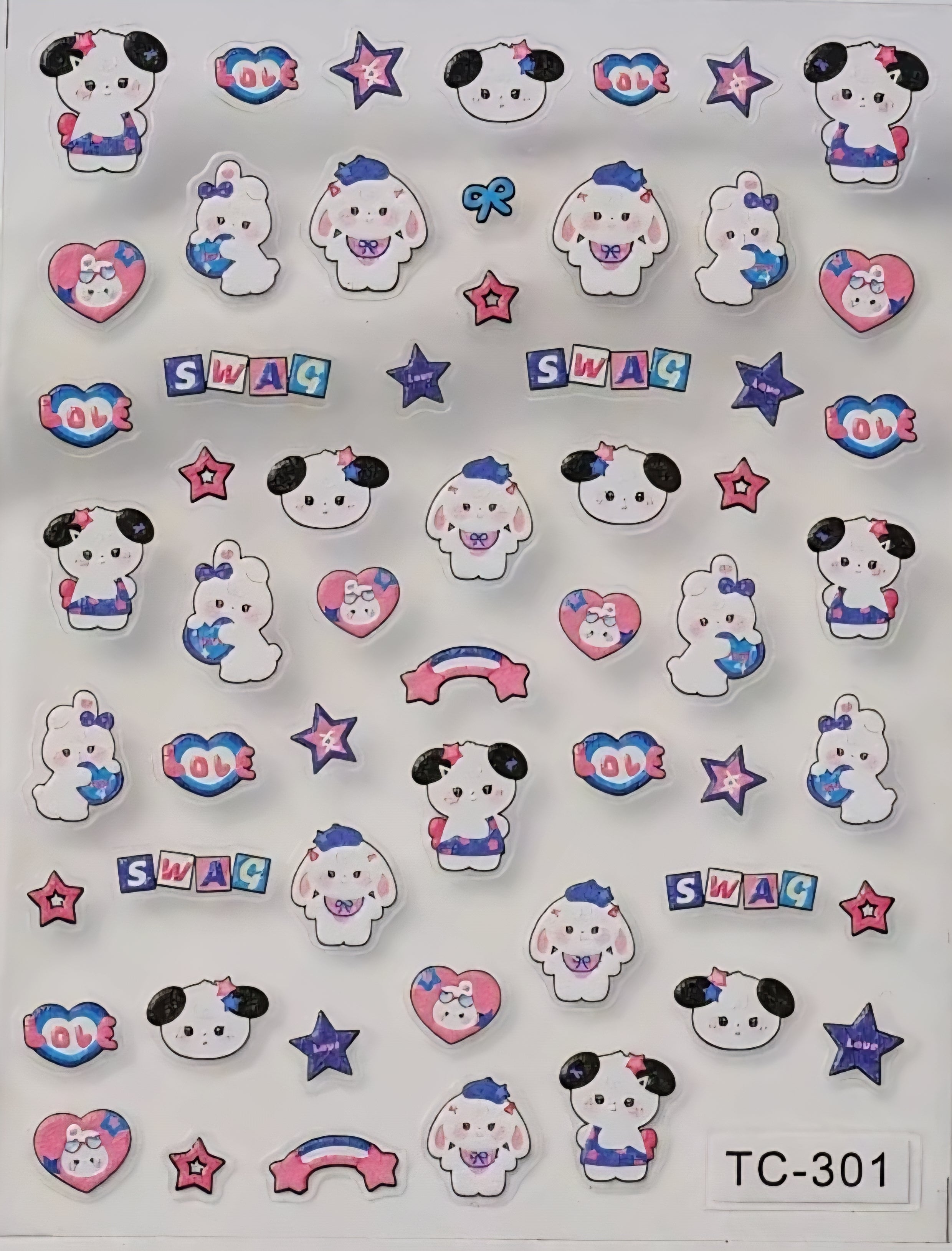 Say hello to Galaxy Pup 5D Nail Stickers – TC-301, the ultimate throwback-meets-kawaii sticker sheet. Featuring star-eyed pups, heart-eyed bunnies, sparkly "LOVE" badges, and chunky rainbow blocks that spell out SWAG, this set brings major Y2K vibes to your mani.
