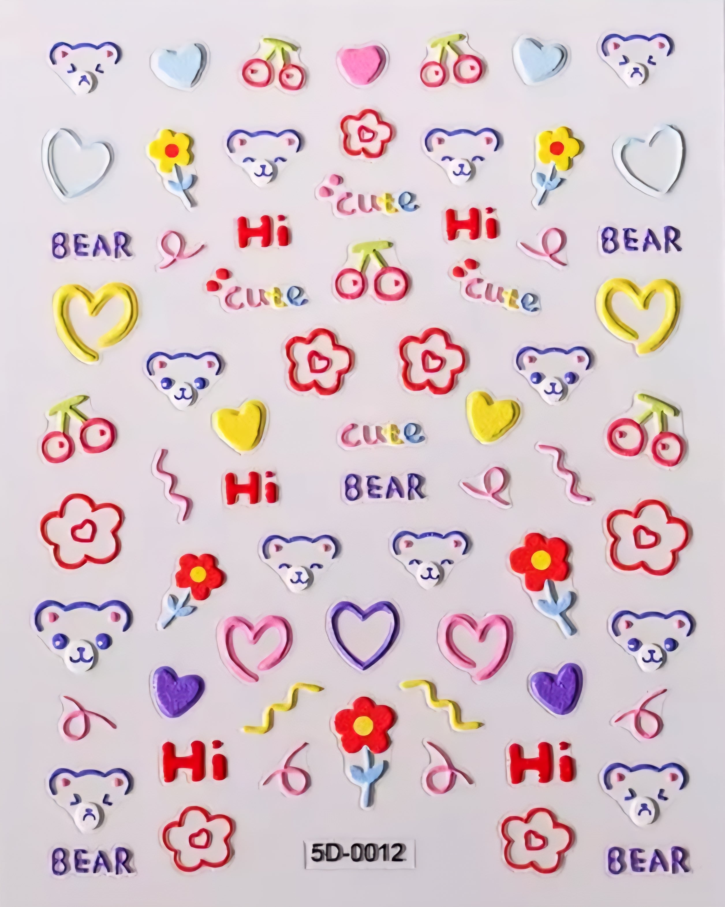 Let your mani get loud, colorful, and unapologetically cute with Hi Bear 5D Stickers – 5D-0012. This set is packed with multicolor bear faces, hearts, flowers, cherries, and words like “Hi,” “Cute,” and “BEAR” in playful bubble lettering. The puffy 5D finish adds dimension, making every sticker pop like candy.