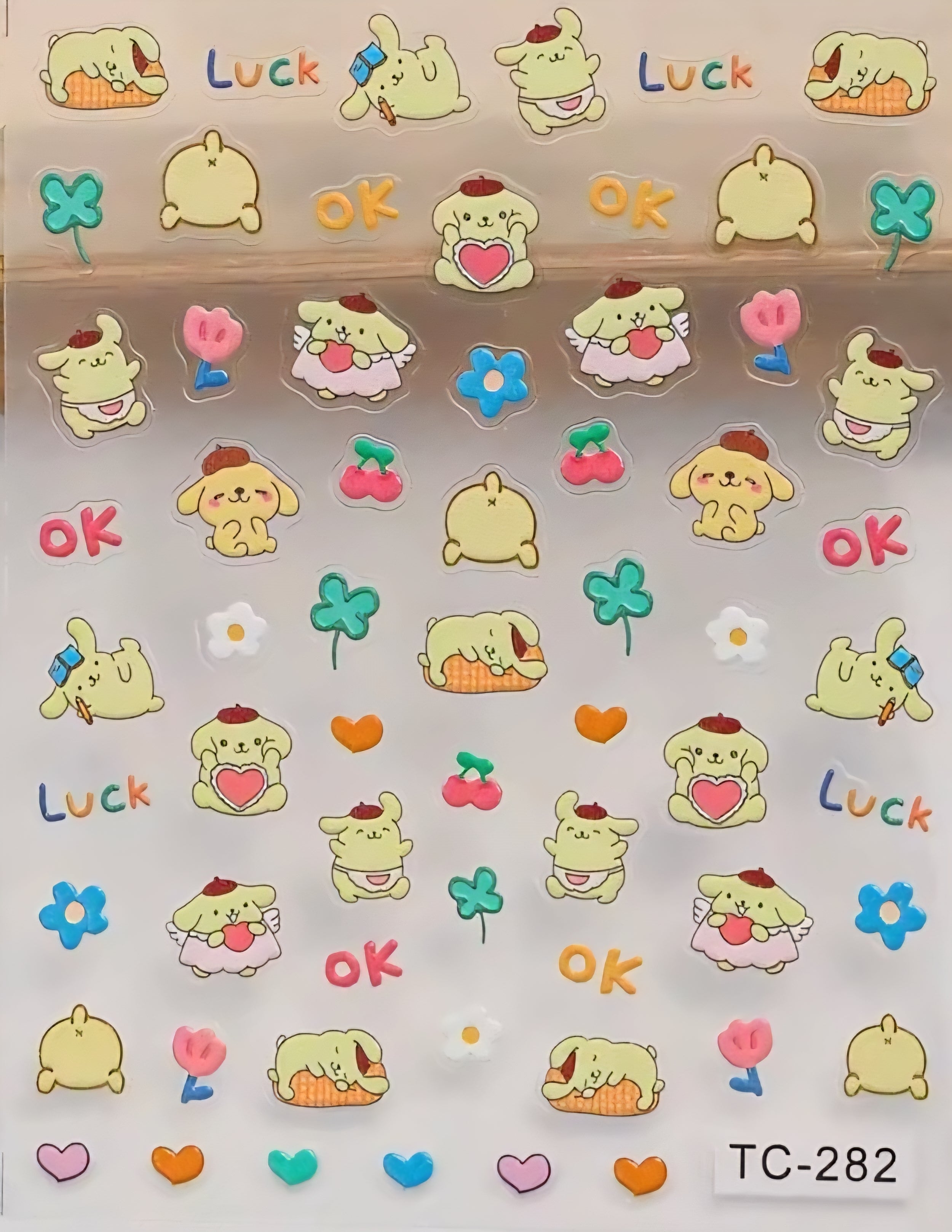 TC-282 is pure serotonin in sticker form. Featuring a chubby yellow pup (you know the one 🐶💛) in all kinds of kawaii poses – sleeping, dancing, blowing kisses – this sheet is a playful dream. Dotted with cherries, hearts, clovers, and happy little “OK” and “Luck” messages, it’s basically nail art with built-in positive vibes.