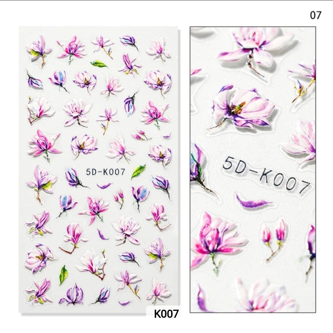 5D-K007 features dreamy magnolia blossoms in painterly shades of lavender, rose, and blush. With subtle 3D texture and delicate leaf accents, this set is perfect for garden-inspired nails, spring sets, or bridal florals with an artsy touch.