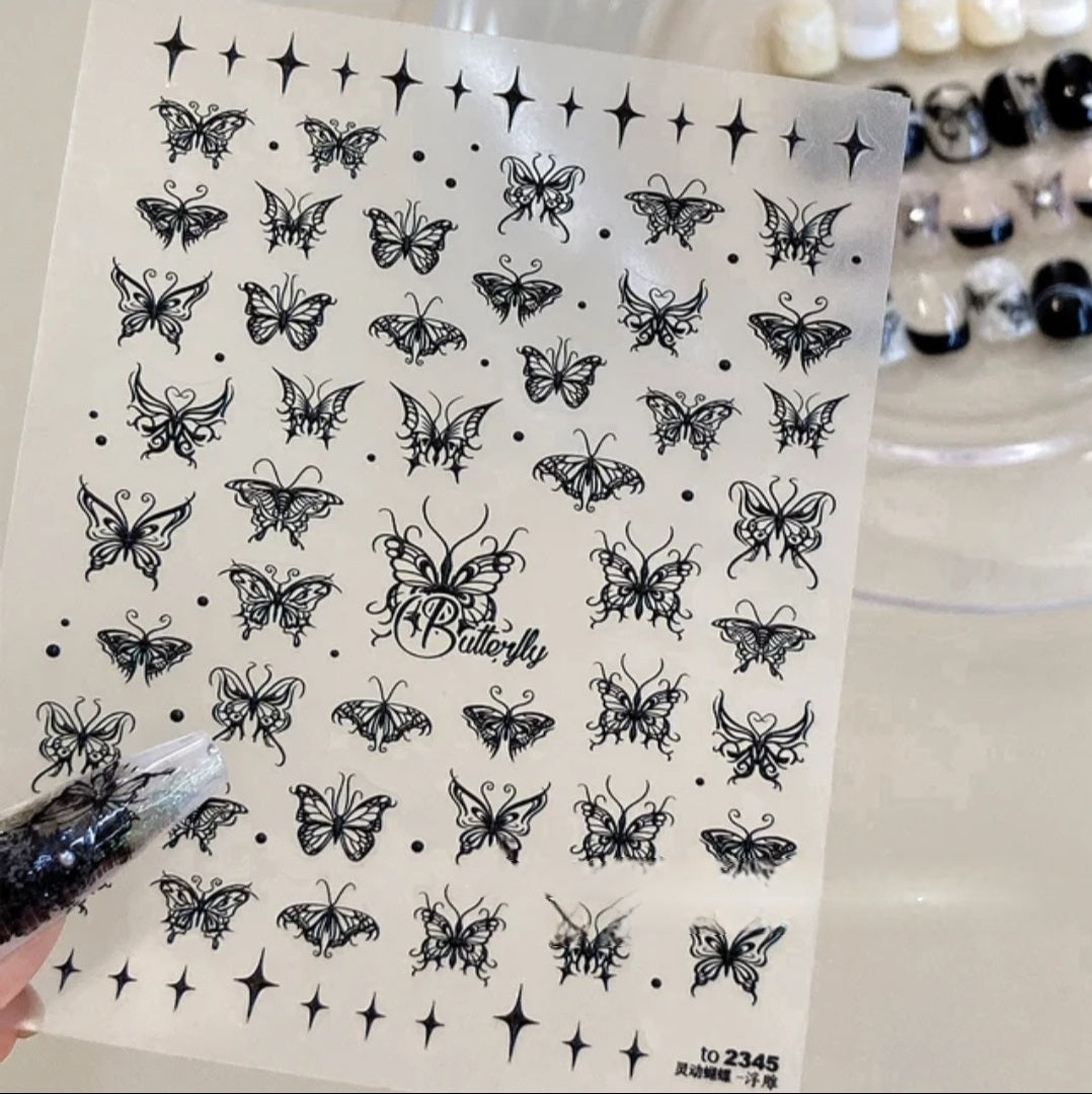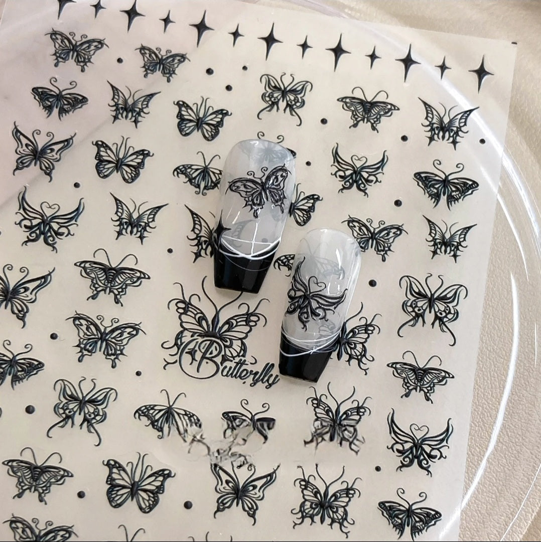 TO2345 brings a dreamy, gothic twist to nail art. Featuring intricately inked butterfly wings in a variety of bold, lacy designs—plus matching stars and dots—these stickers instantly turn any manicure into a fluttery statement.
