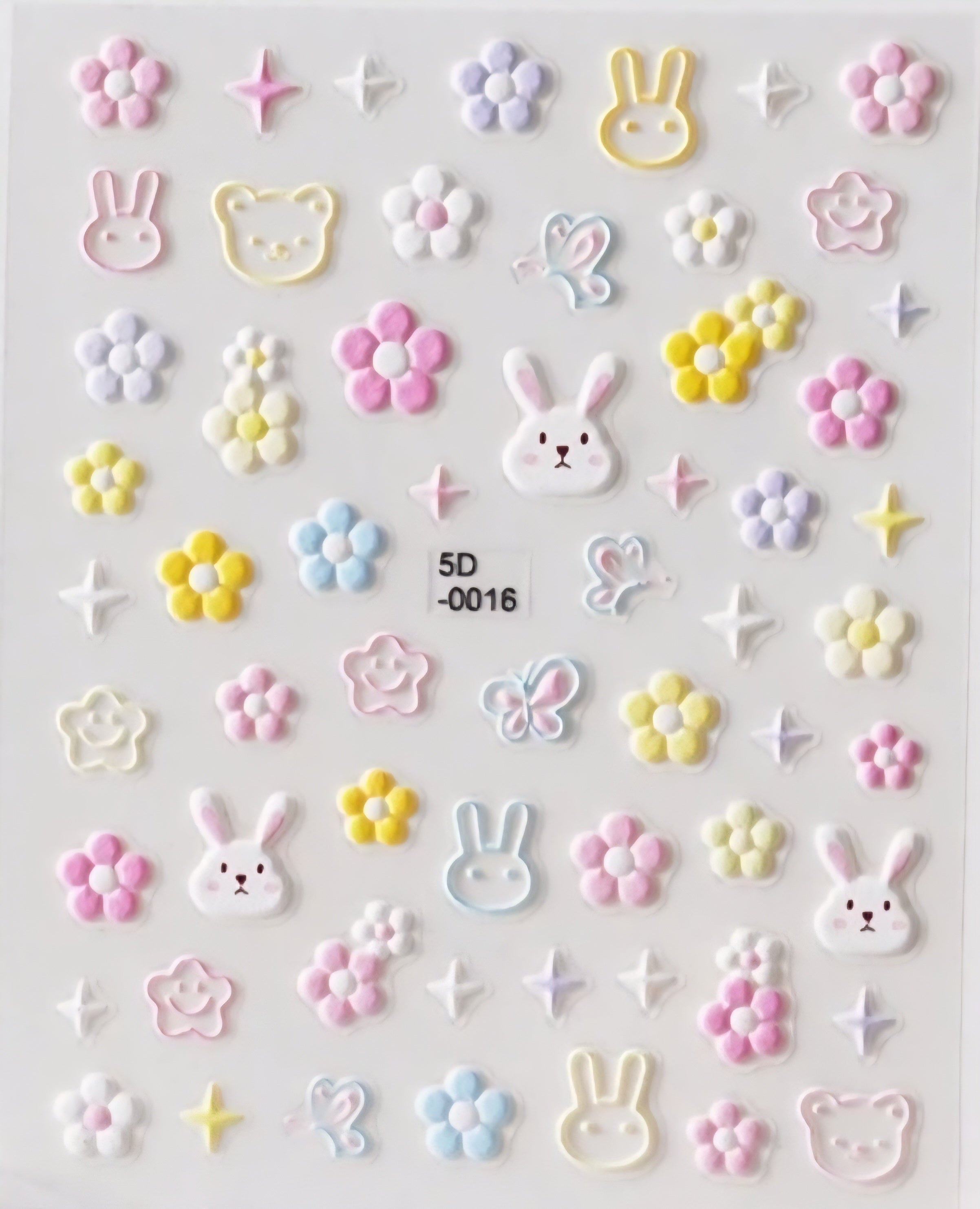 5D0016 is what happens when a kawaii dream meets springtime magic. Featuring adorable bunny faces, teddy bear heads, daisy blooms, butterflies, and twinkling stars—all in soft pastel hues of baby pink, lemon, sky blue, and lilac.