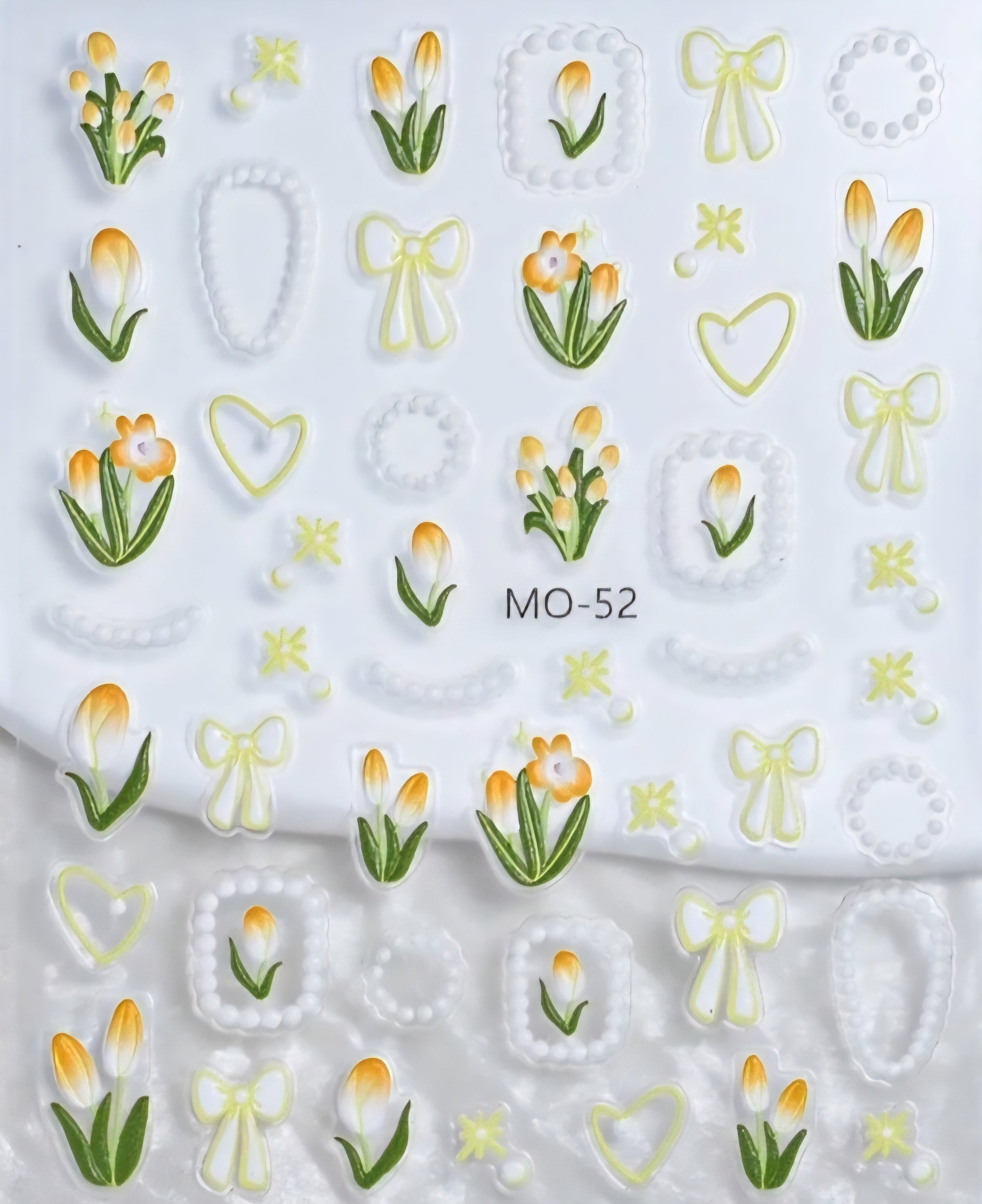 MO-52 brings a burst of sunshine to your fingertips! This design features fresh crocus flowers in radiant yellow and soft orange, paired with dainty details like pearl-framed florals, heart outlines, and pastel bows. The overall vibe is soft, sweet, and a touch playful — like a spring morning picnic in sticker form.