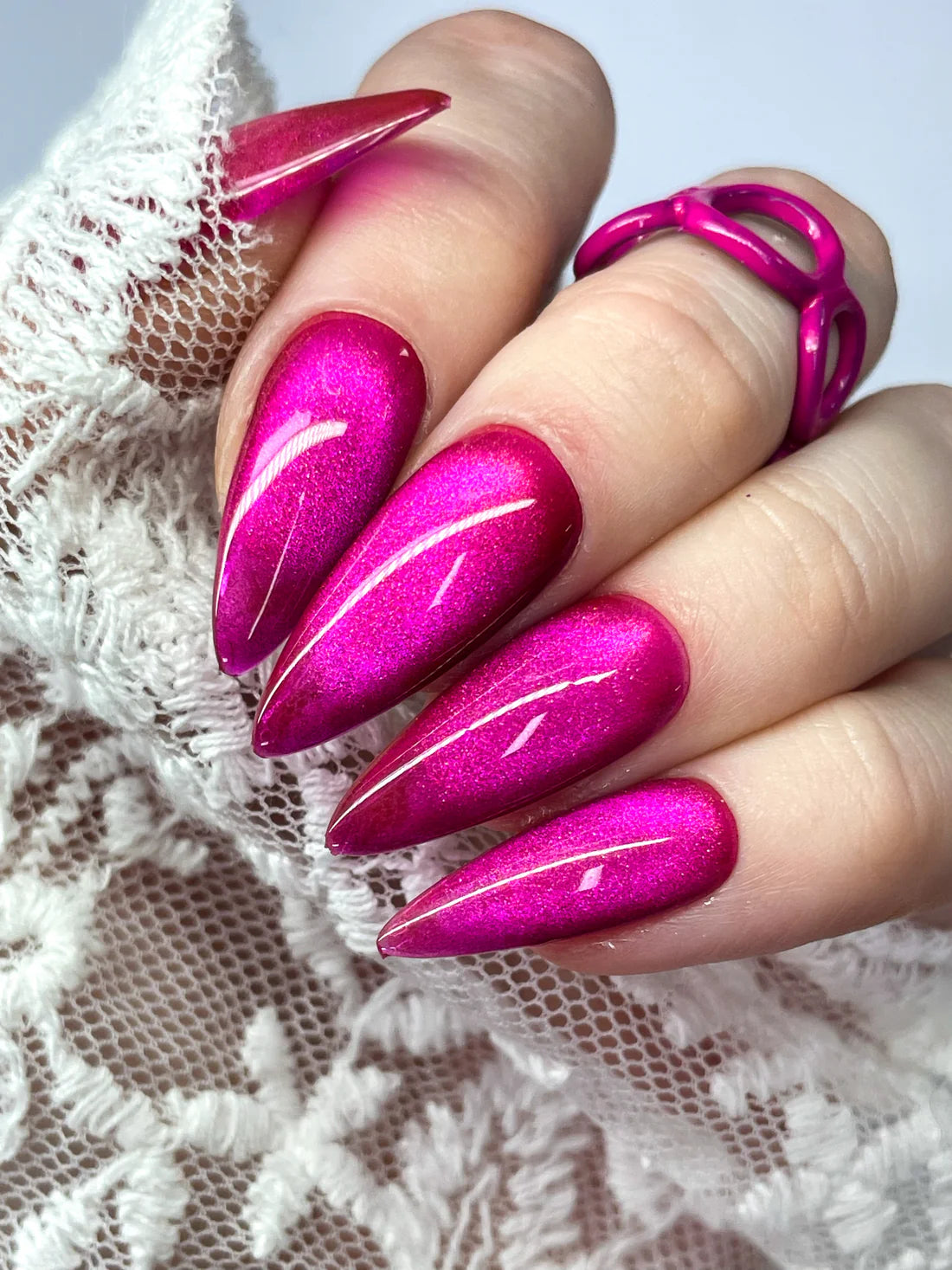 "Pinque Potion," the sassy sorceress of the nail world! This bewitching hot pink Cat Eye gel polish is like a flirtatious whisper from a mischievous feline, casting a spell of vibrant charm on your nails. Every glance at your hands becomes a spellbinding encounter with the captivating "Pinque Potion." Let your nail game be as bold and cheeky as the sassiest sorceress in town!