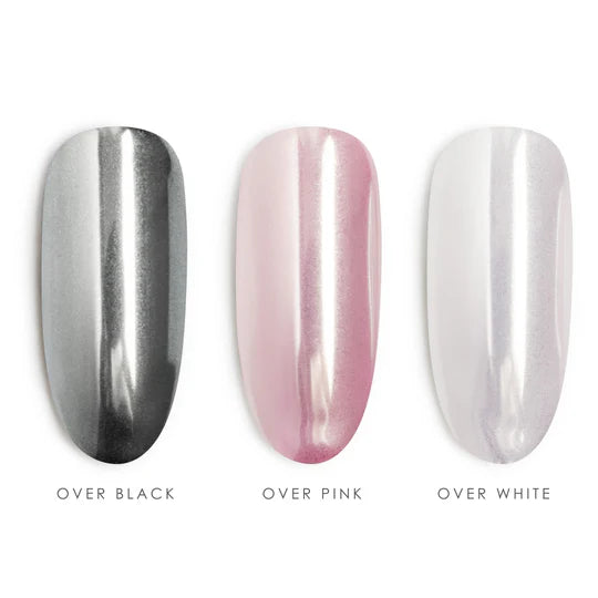 Apply base color of choice and seal with No Wipe Topcoat for 60 seconds. Once No Wipe is cured, wipe the surface of the topcoat with Isopropyl Alcohol, then burnish on your CHROMEEZ chrome powder of choice with our CHROMER tool, or SILICONE TOOLS. Gently dust away excess chrome powder, then seal with preferred topcoat and fully cure for 60 seconds. IF YOU ARE APPLYING A FULLY CHROMED NAIL: It's best to always hand file the free edge and sidewalls lightly with a medium grit hand file to remove any chrome powder that may have wrapped around the free edge of the nail. Gently remove any dust, then apply a coat of Clear Build-A-Base on free edge & sidewalls of the chrome, cure, then topcoat the entire nail with your preferred topcoat and fully cure.