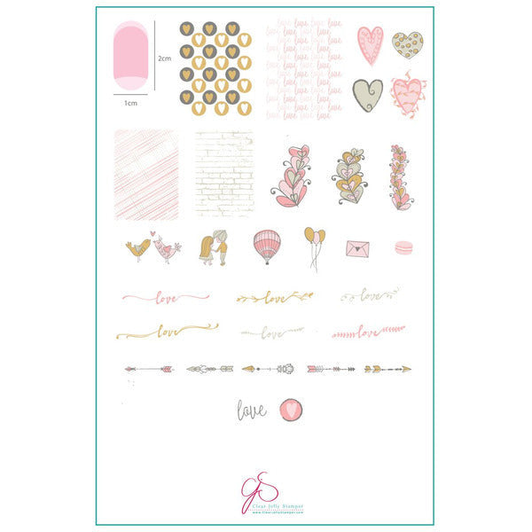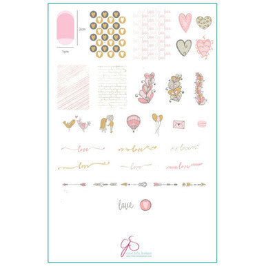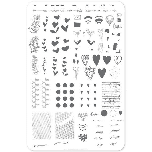 Adorable and sweet plate with endless possibilities (Yes... like all our other plates). Cute little guy and girl... one for each nail when popped together are holding hands! Awwwwwww... Fantastic backgrounds... stacks of hearts-literally!