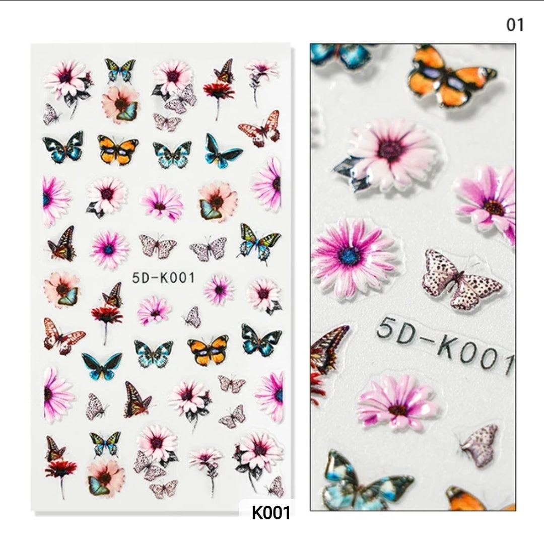 5D-K001 pairs colorful butterflies with vibrant daisies in pink, coral, and white for a fresh, whimsical design. Each sticker has a soft 3D lift that brings dimension without bulk. Perfect for sunny sets, spring looks, or playful, nature-loving manis.