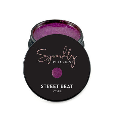 FUZION UV/LED SPARKLEZ - STREET BEAT - 15 GM Street Beat: neon eggplant microfine reflective sparkle (Street Beat is a slightly thinner viscosity than previous Sparklez.) Easy-to-use viscosity Highly pigmented Perfect for applying on top or embedding 2 thin coats are recommended for optimum results UV/LED 60s 15gm