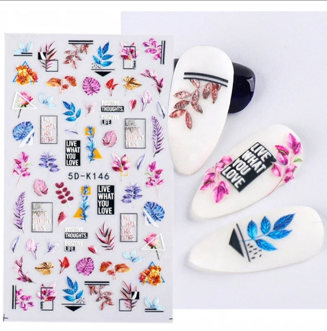 The 5D-K146 sticker set is your go-to for motivation meets modern art. Packed with vibrant leaves, geometric accents, and phrases like "Live What You Love" and "Positive Thoughts, Positive Life", it’s the perfect combo of sass and soul. Great for white, nude, or high-gloss bases.