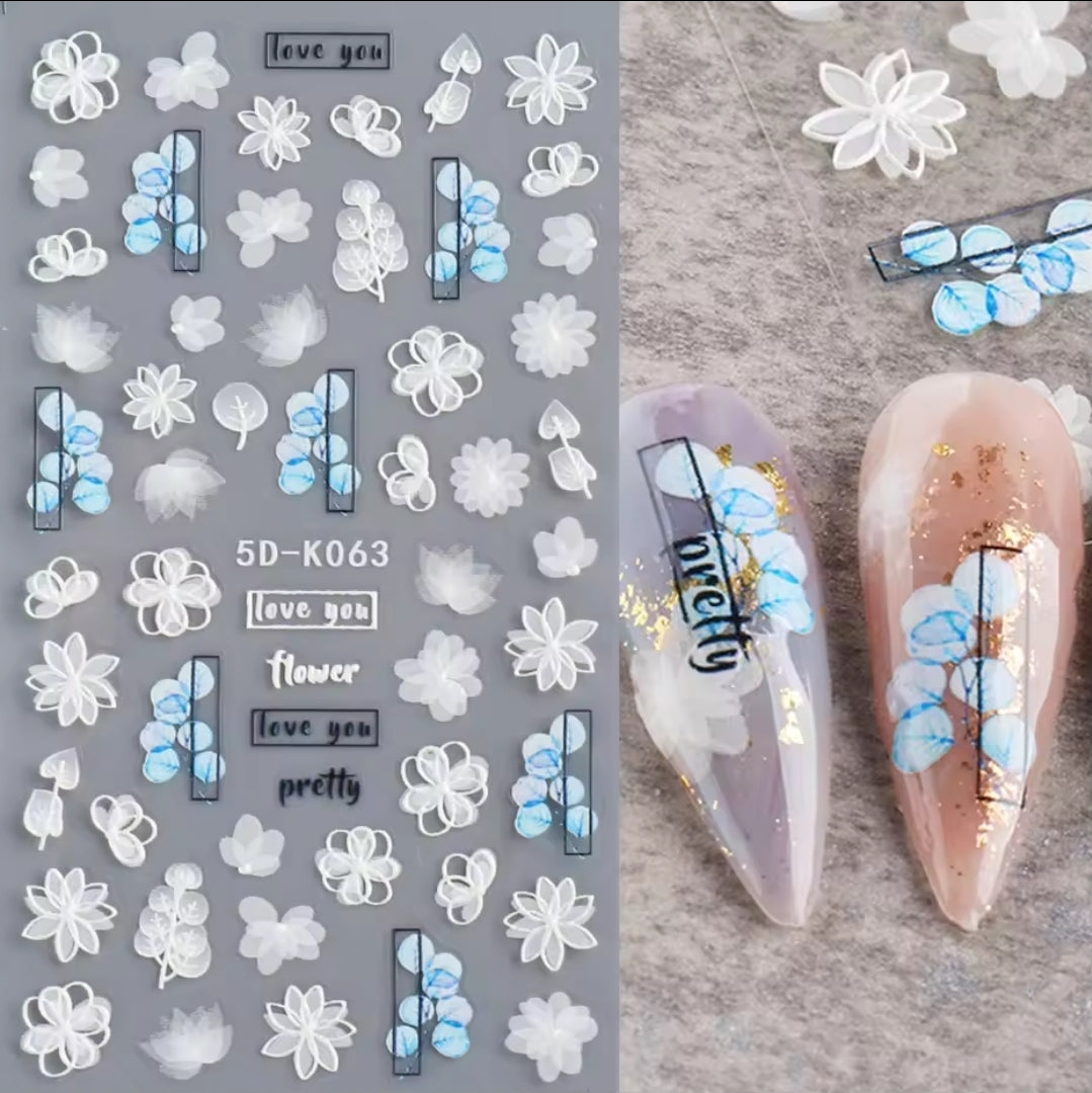 5D-K063 is made for soft glam lovers—featuring delicate white and blue flowers, translucent layering petals, and minimal words like “pretty” and “love you.” Perfect for milky bases, jelly tips, or gold foil sets. Adds just enough mood without taking over the look.