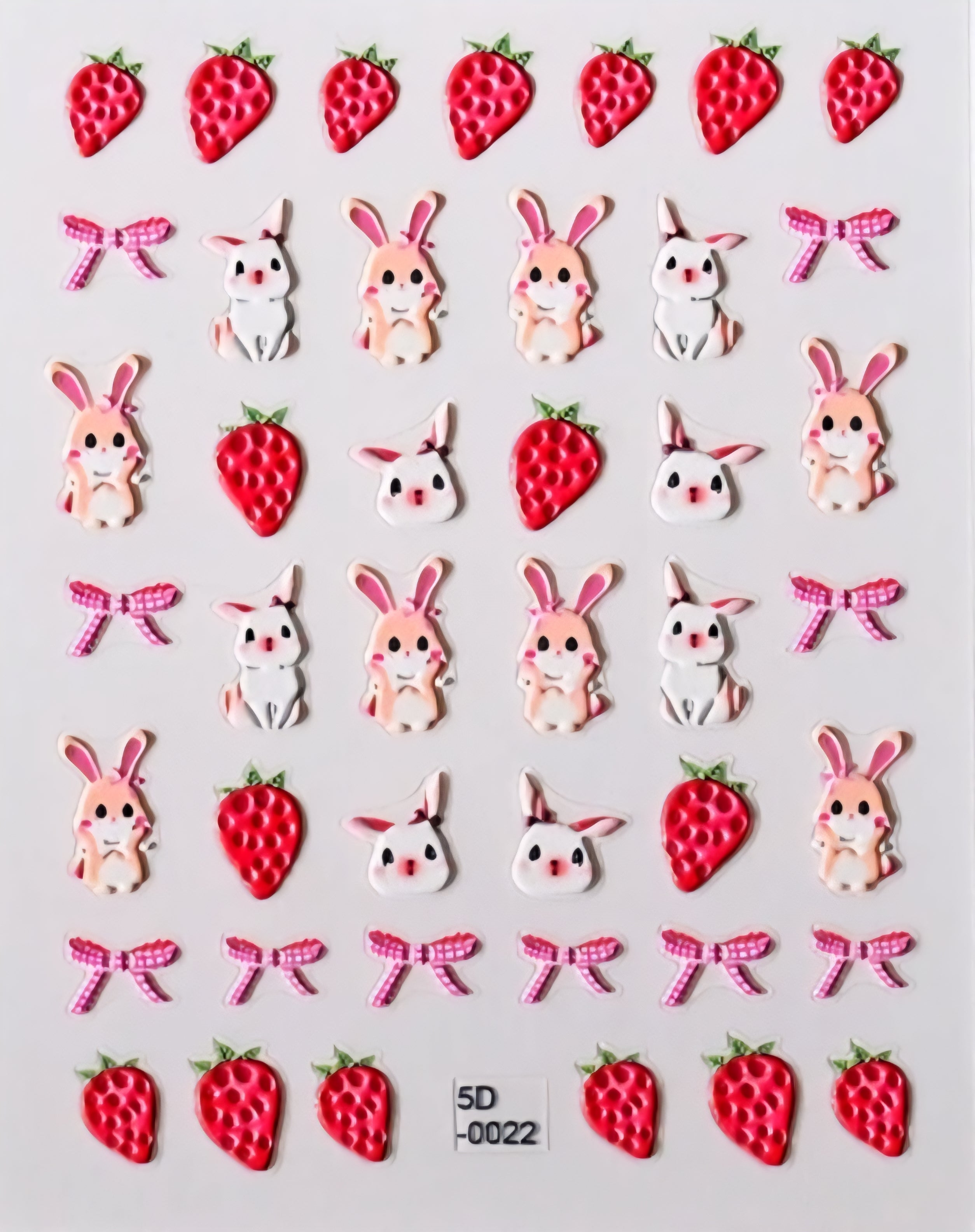 Nail cuteness level: maximum. 🍓🐰🎀 The 5D-0022 sticker sheet brings you an irresistible trio—fluffy pink and white bunnies, plump strawberries, and gingham bows, all in dreamy 3D texture. Whether you're channeling cottagecore or just feeling fruitfully playful, these stickers are perfect for creating a manicure that’s sweet, fresh, and fun.